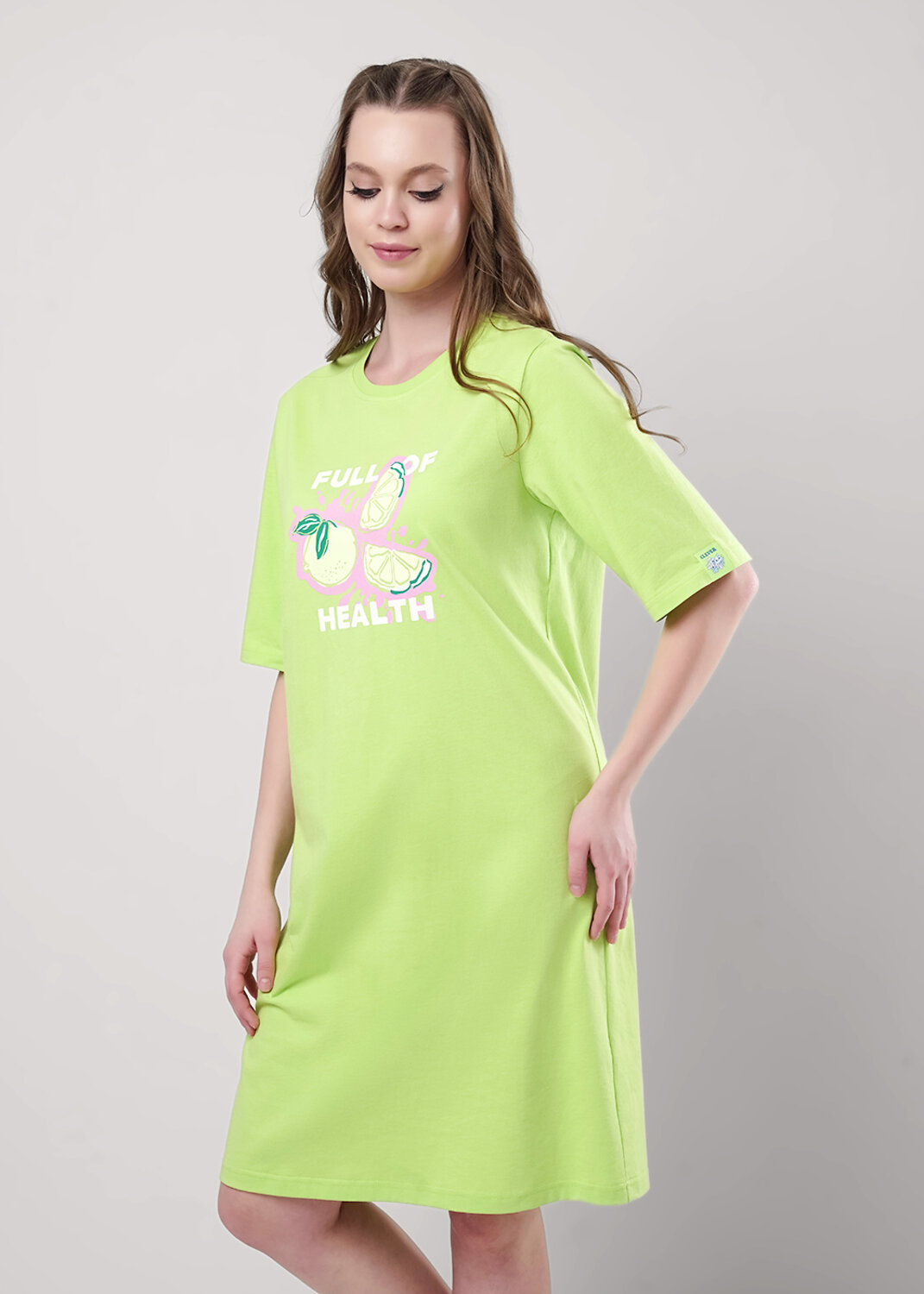 Платье для дома прямого кроя из хлопкового трикотажного полотна. Округлая горловина с обтачкой из кашкорсе. Короткий втачной рукав, нашивка. Спереди принт. Сзади по спинке внутренняя кокета, застил.
