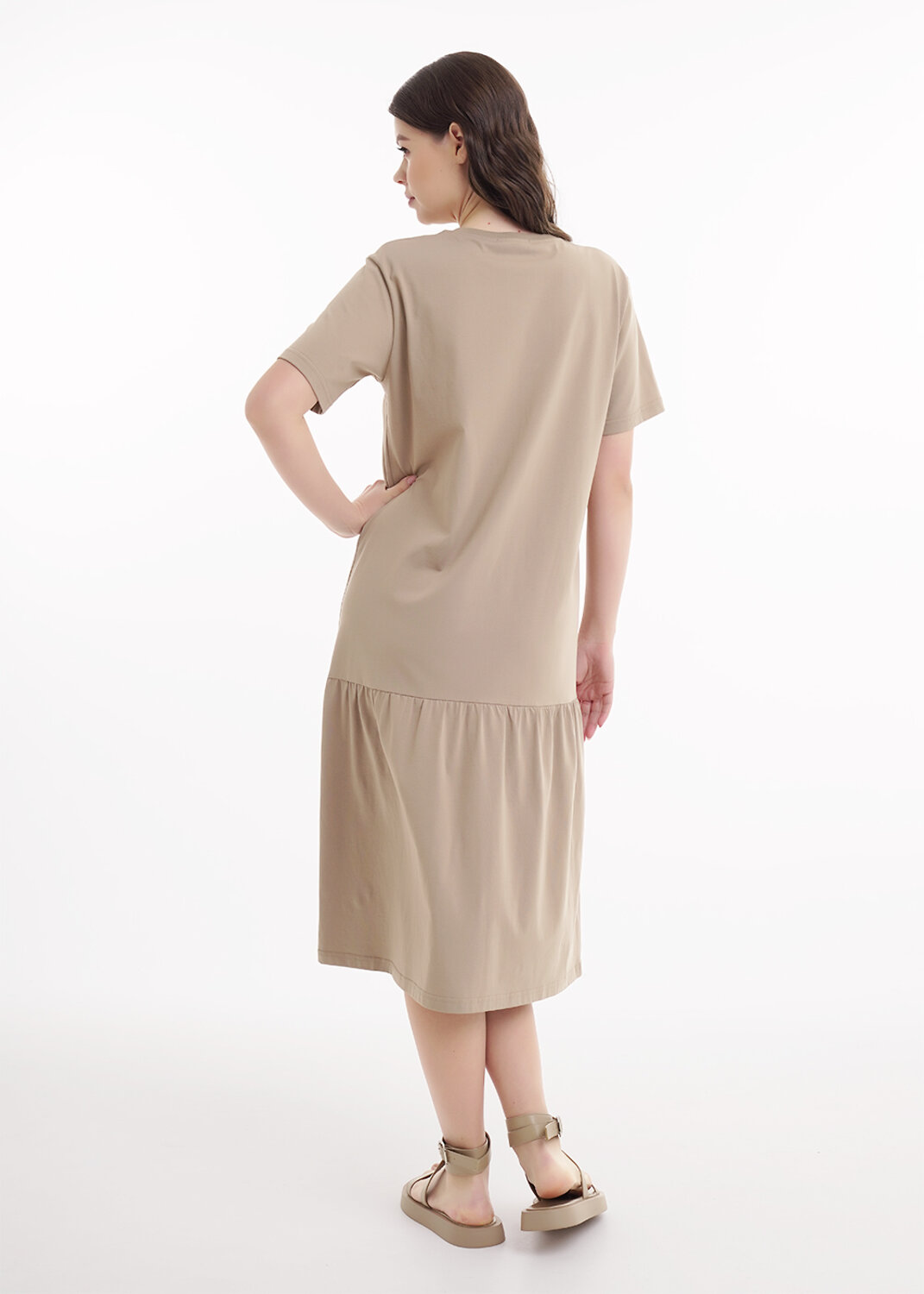 Платье для дома и отдыха из хлопкового трикотажного полотна,прямого силуэта. Втачной короткий рукав, внизу термонаклейка силикон. Округлая горловина с обтачкой. По низу изделия отрезная юбка, собрана на сборку. Спереди принт,вышивка.