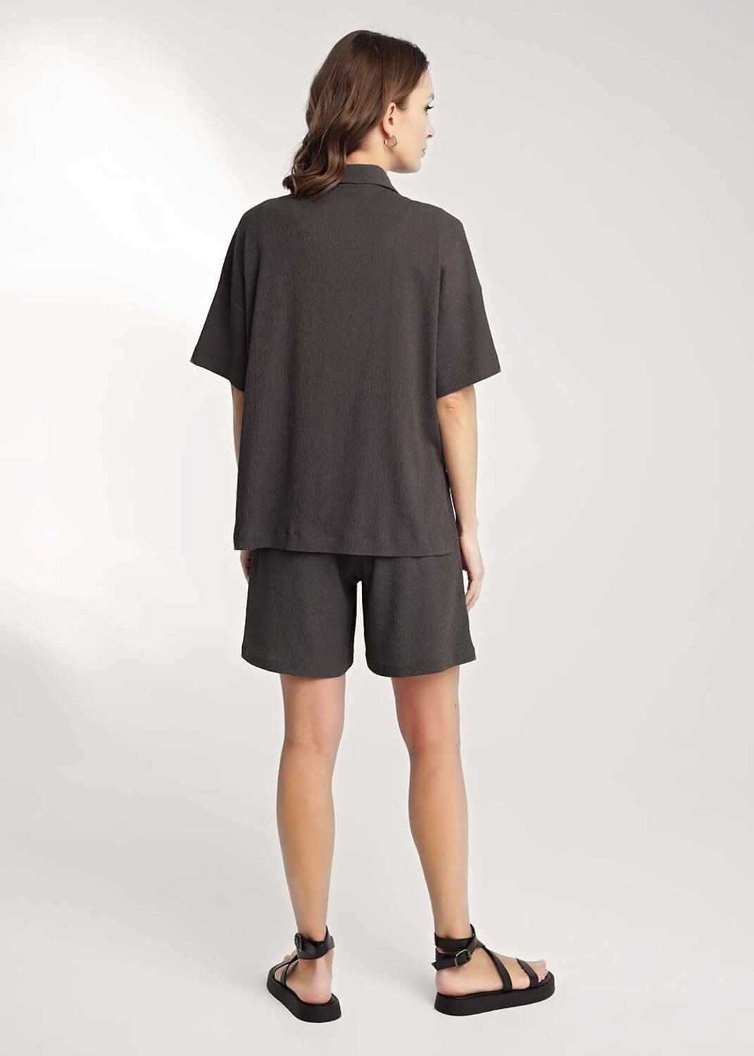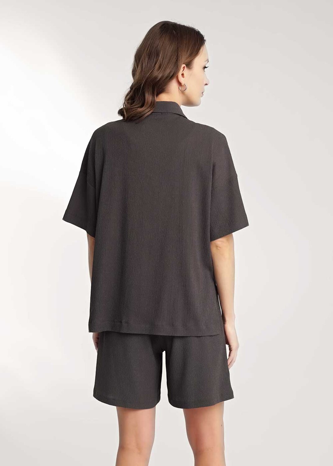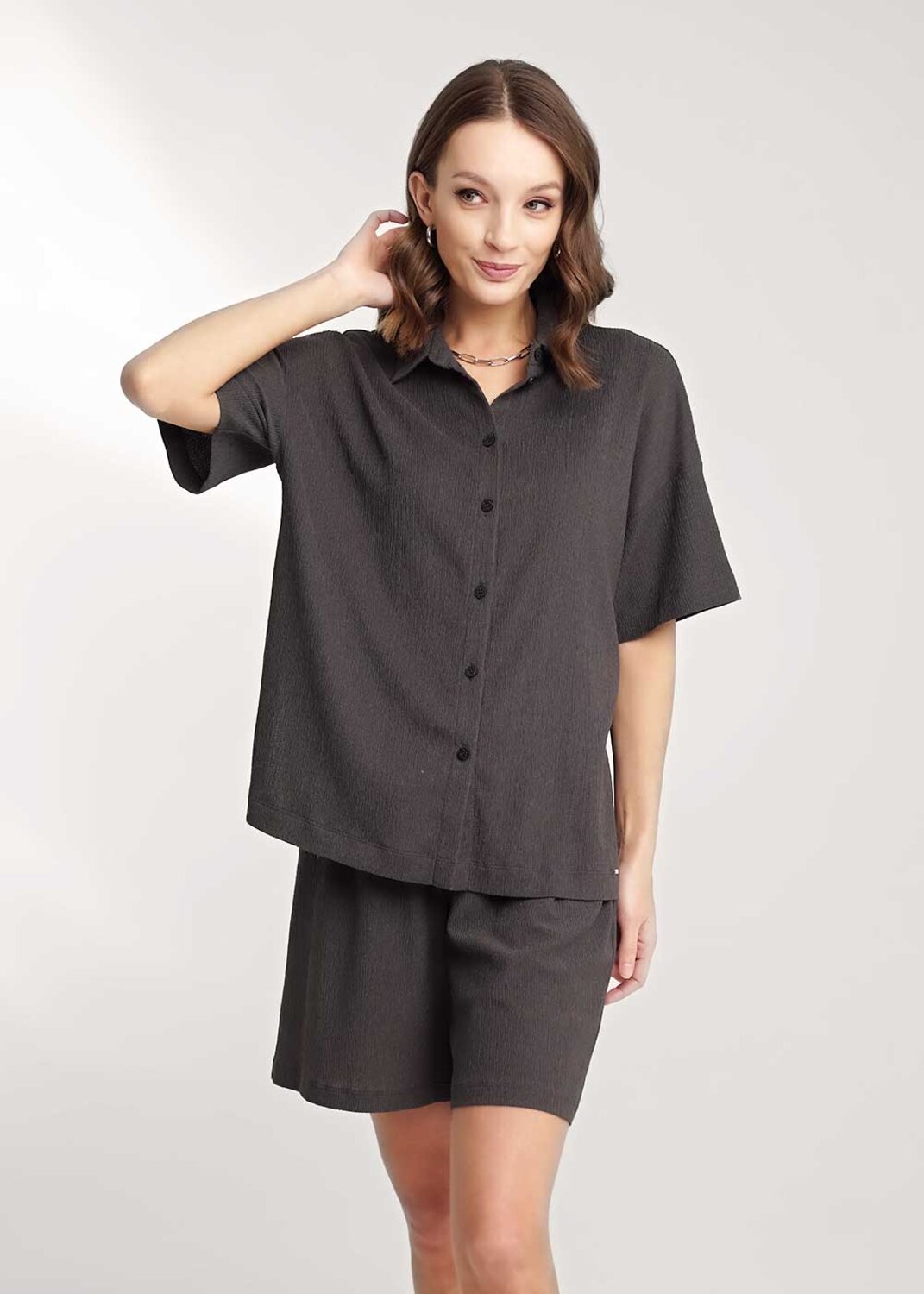 Блузка из вискозного трикотажного полотна джерси, свободного кроя. Втачной короткий рукав. Отложной воротник со стойкой, спереди цельнокроеная планка на пуговицах. Боковые разрезы, нашивка металл.