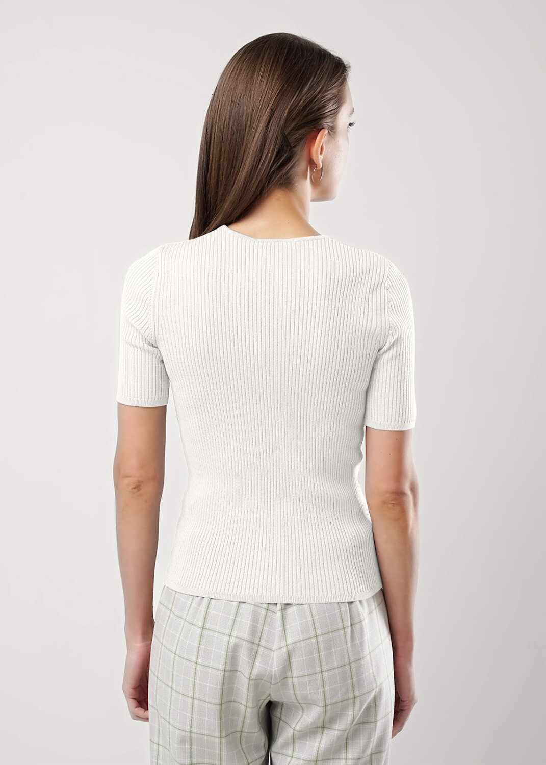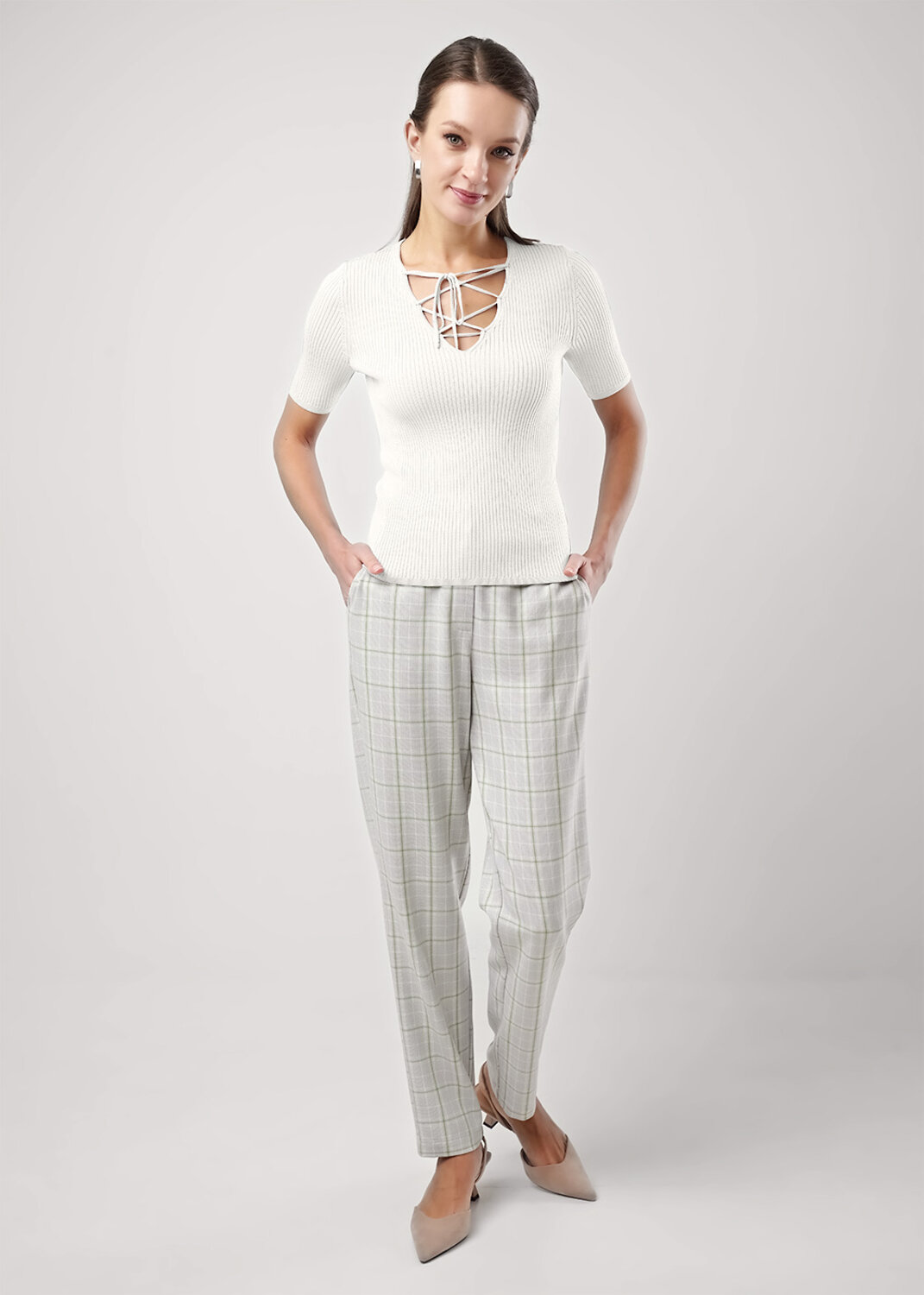 Джемпер прямого силуэта из вискозной пряжи, ластичного переплетения. Короткий втачной рукав. V -образный вырез со шнуровкой.