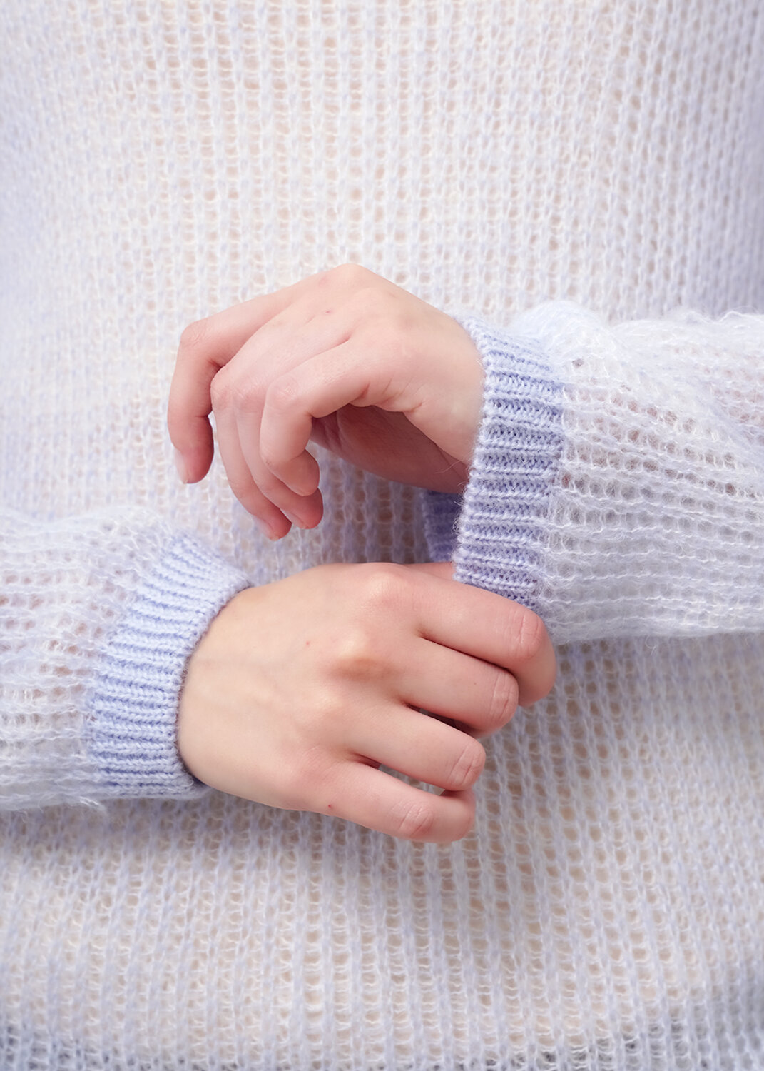 Вязаный джемпер из акриловой пряжи, переплетения "полуфанг". Длинный втачной рукав. Округлая горловина с бейкой. По горловине и манжетам ластик.