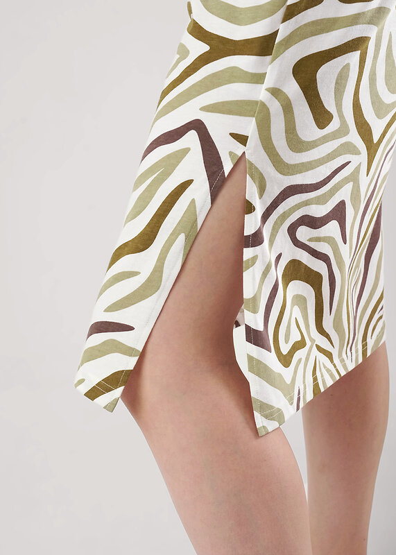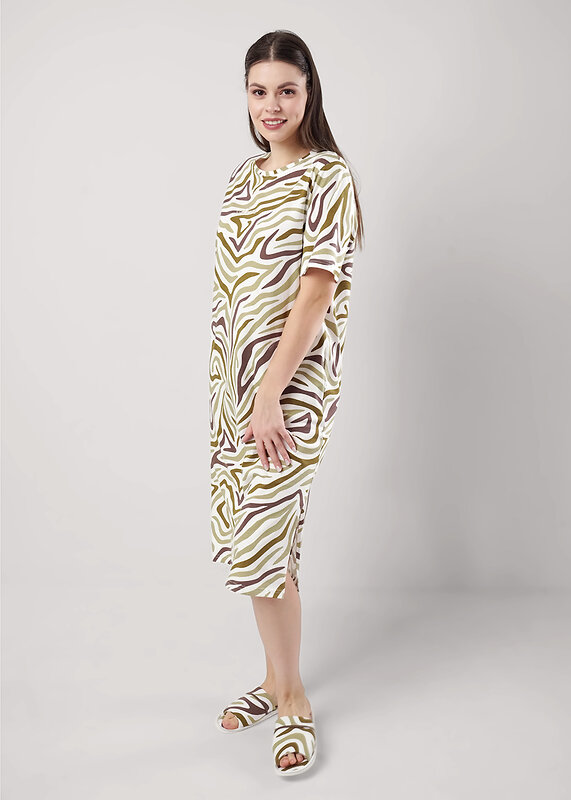 Платье для дома и отдыха из хлопкового трикотажного полотна. Короткий втачной рукав. Округлая горловина с обтачкой. Карманы в боковом шве. По бокам разрезы. Спереди термонашивка.