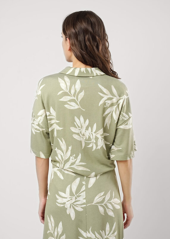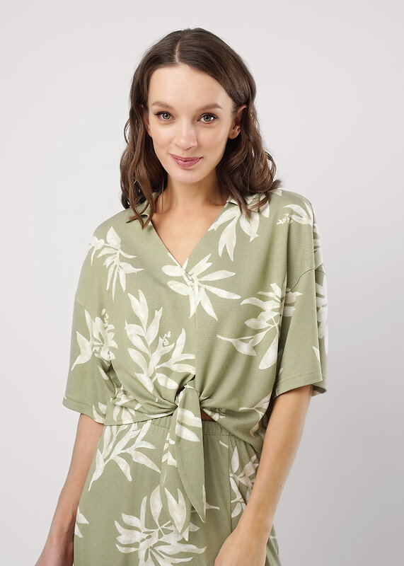 Блузка из вискозного трикотажного полотна пике свободного силуэта. Короткий втачной рукав. По горловине отложной воротник с внутренней обтачкой. Спереди имитация борта с внутренней обтачкой, по низу бант завязка.