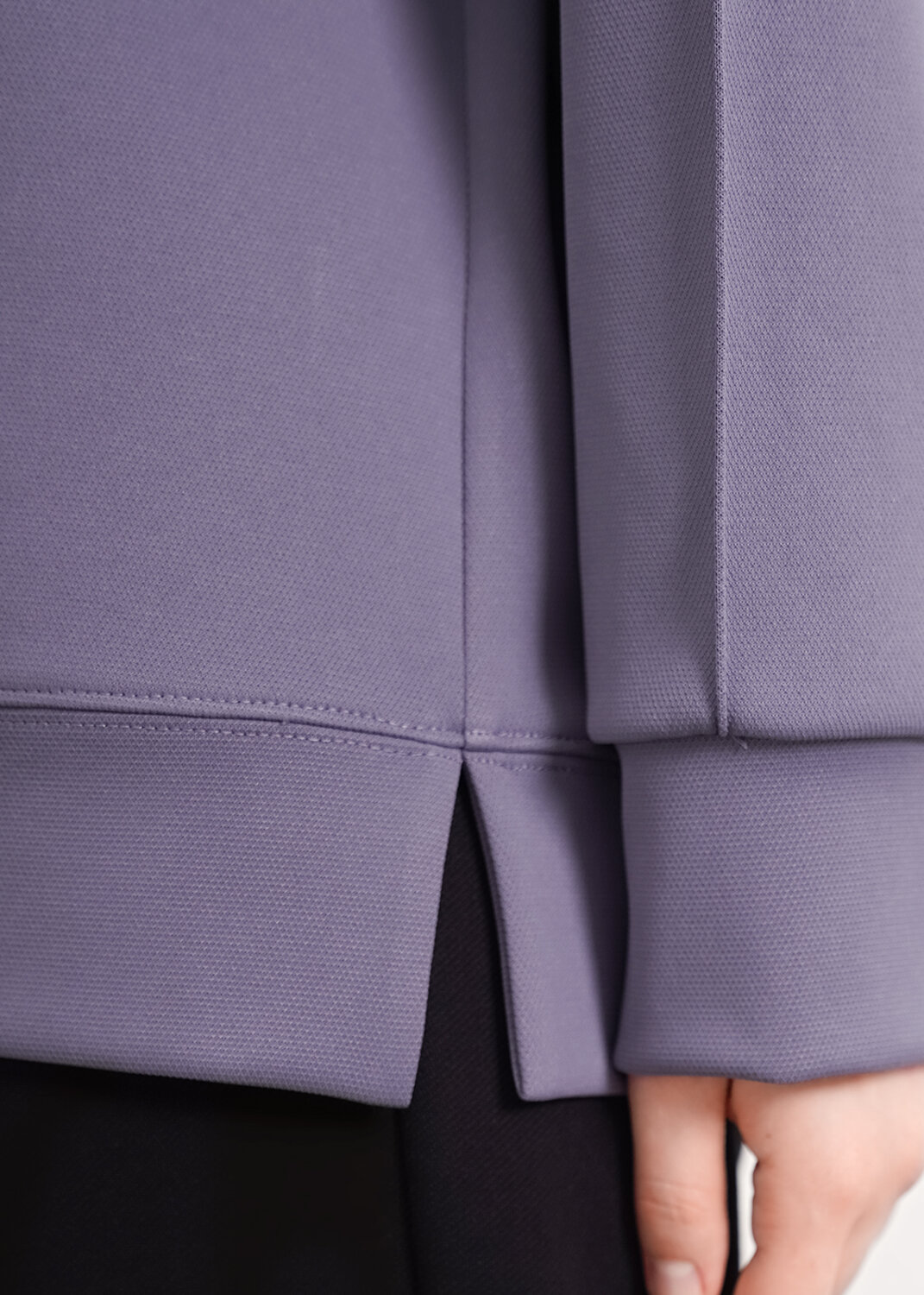 Джемпер из трикотажного полотна джерси фактурное, свободного кроя. Округлая горловина с обтачкой. Длинный рукав со спущенной линией плеча, по низу манжеты. По переду декоративные защипы. По низу изделия манжет с боковыми разрезами.