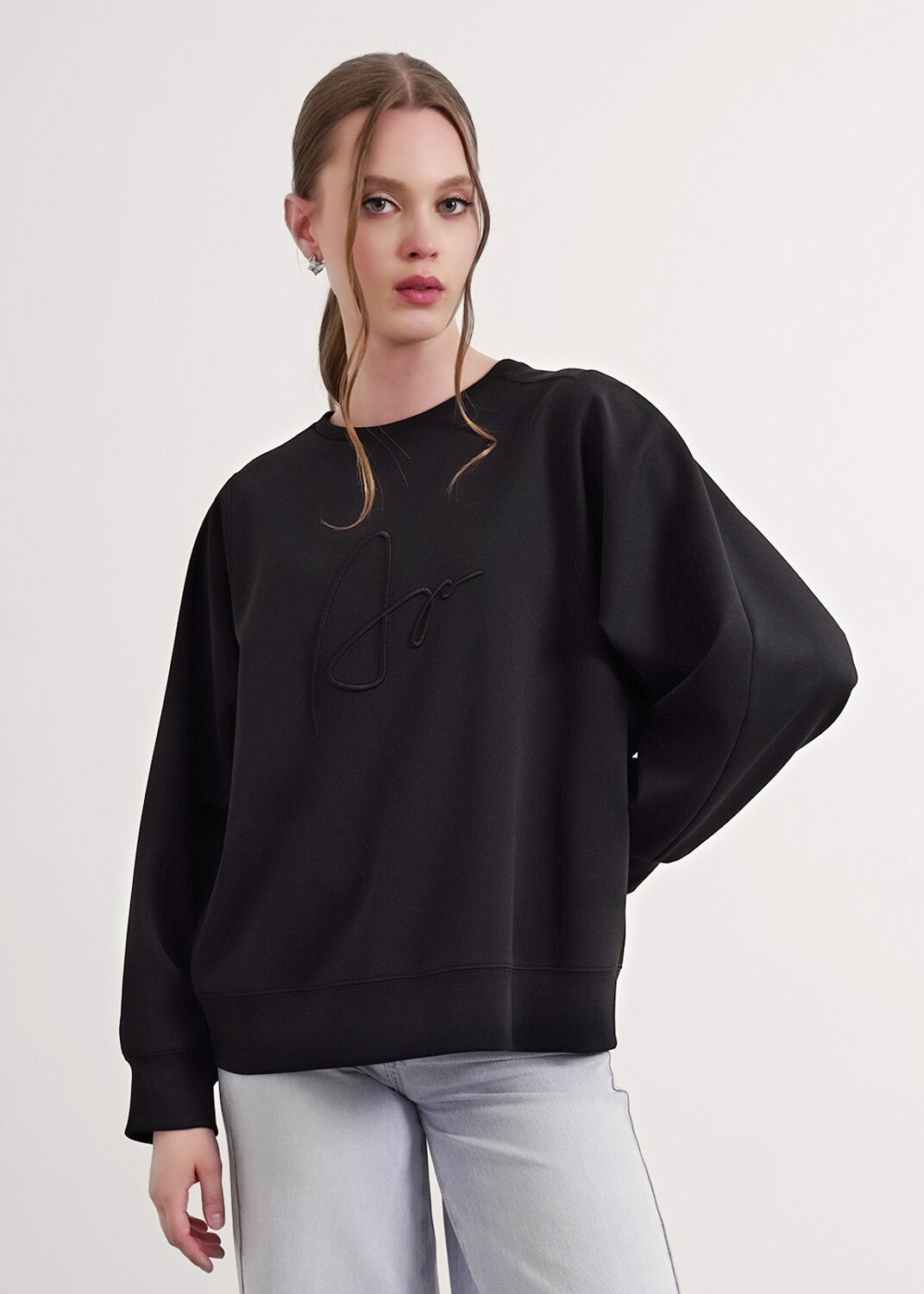 Джемпер из трикотажного полотна джерси фактурное, свободного кроя. Округлая горловина с обтачкой. Спереди по плечевому шву небольшая кокетка. По спинке рукав реглан, спереди рубашечный. По низу изделия и рукавов манжет. Спереди вышивка пеной.