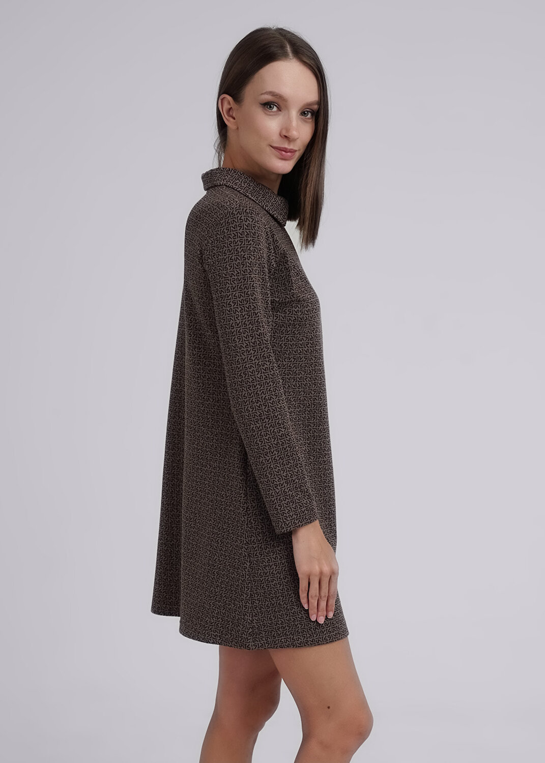Платье из трикотажного полотна джерси, слегка расклешенное книзу, длиной до колена. По горловине отложной воротник с застежкой на молнию. Втачной длинный рукав.