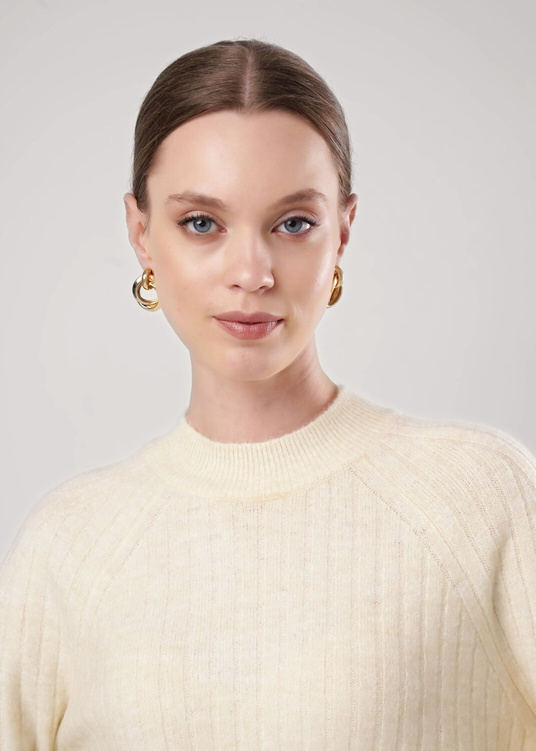 Вязаный джемпер из акриловой пряжи, ластичного переплетения. Длинный рукав реглан. По низу рукава и изделия манжеты. Округлая горловина с бейкой.