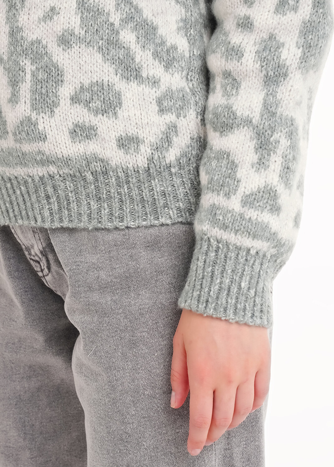 Вязаный джемпер прямого силуэта из акриловой пряжи с добавлением хлопка. Длинный втачной рукав. По низу рукава и изделия манжеты. Основное переплетение жаккард. Округлая горловина с бейкой.
