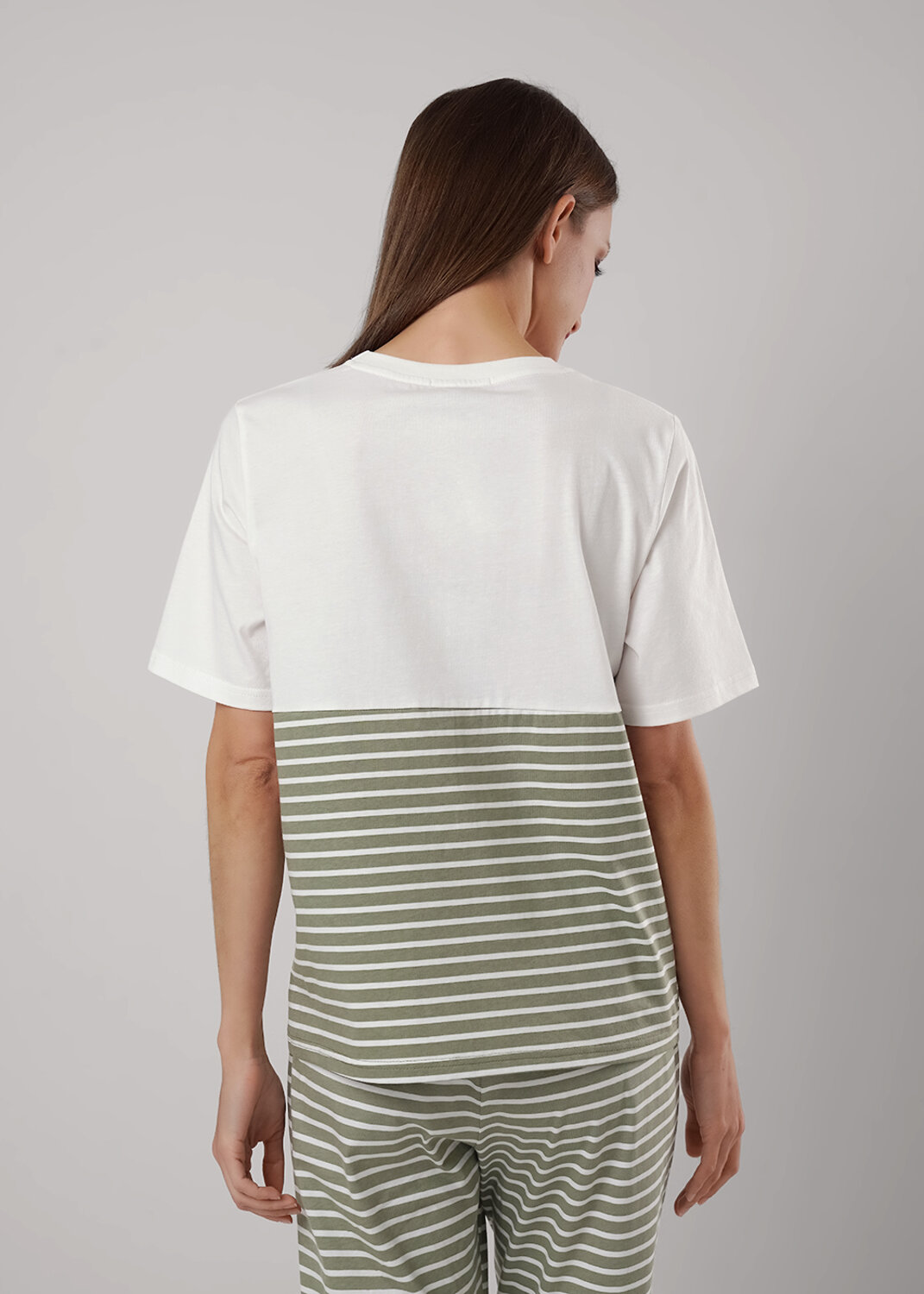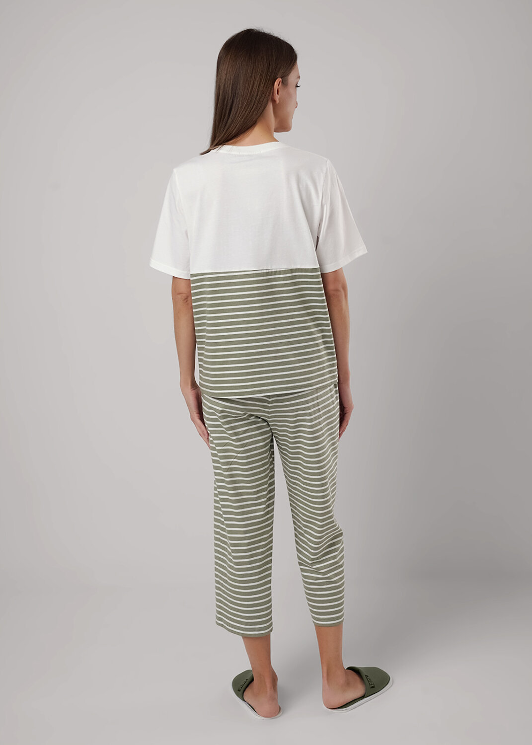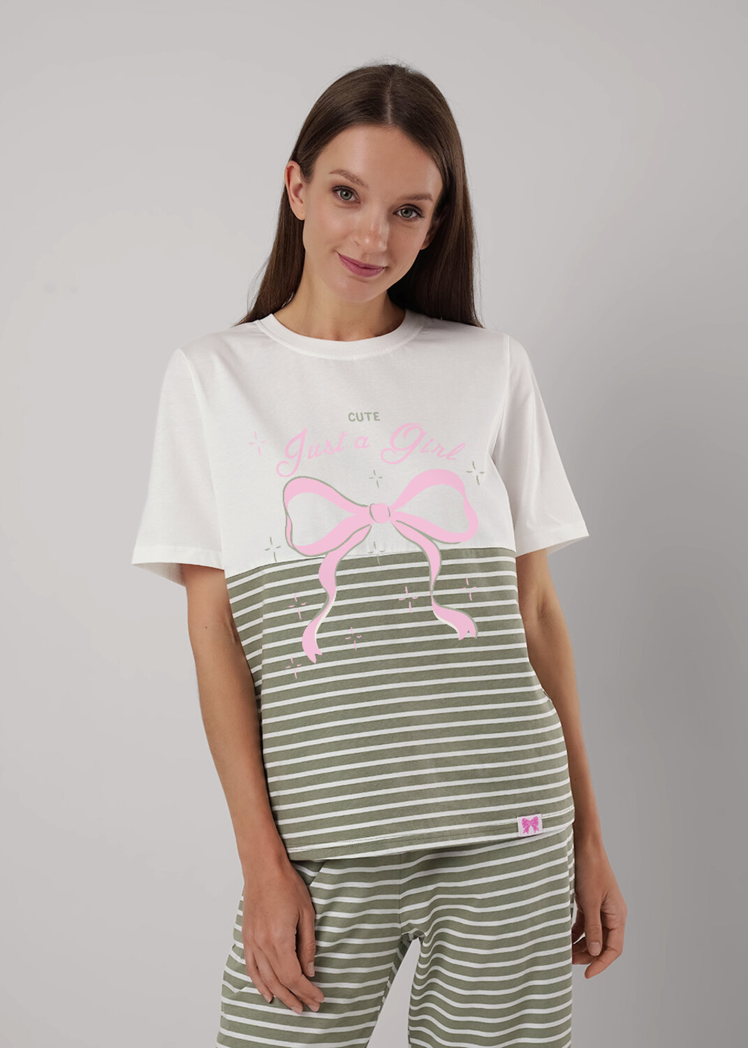 Пижама для дома из трикотажного полотна.Футболка прямого кроя, округлая горловина с обтачкой.По переду, спинке рез.Короткий втачной рукав.Спереди принт,нашивка.Бриджы с поясом на внутренней резинке с киперной лентой. Боковые карманы с отрезным бочком.