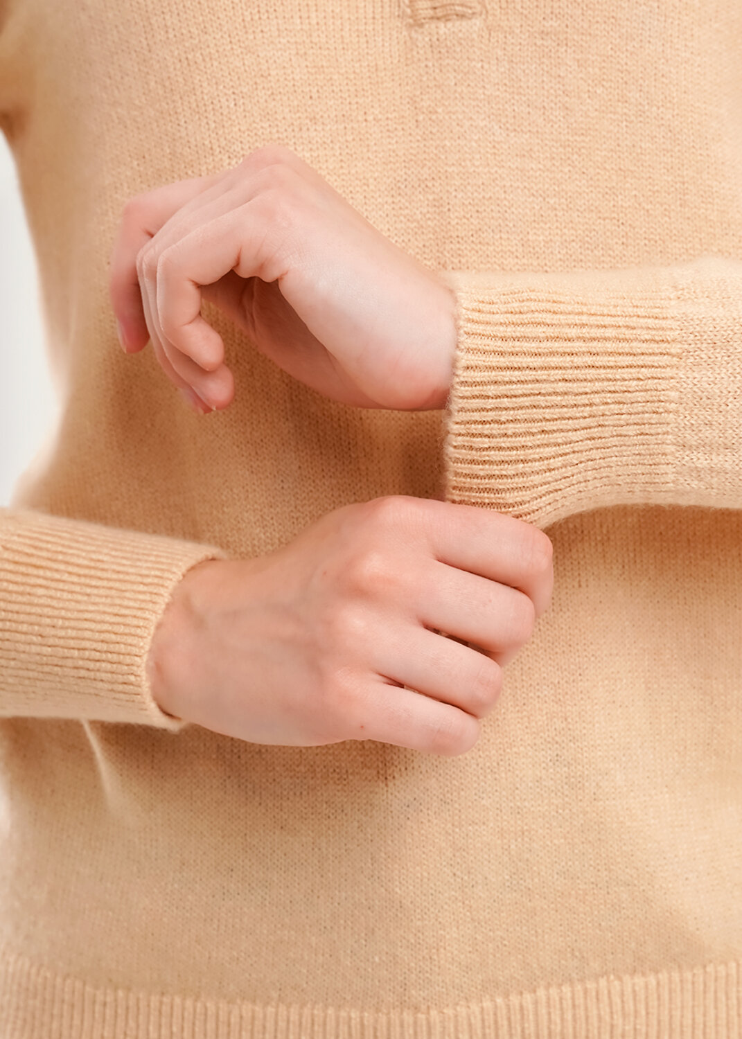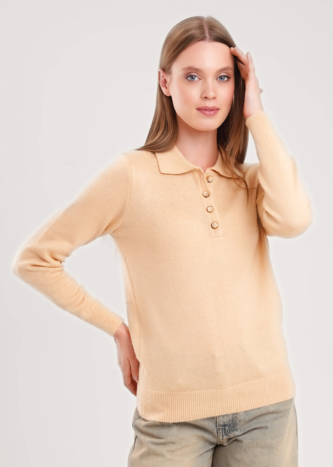 Вязаный джемпер умеренного объема из акриловой пряжи с добавлением шерсти, переплетение гладь. Втачной длинный рукав, по горловине отложной воротник с функциональной планкой и пуговицами. По низу изделия и рукавов манжеты.