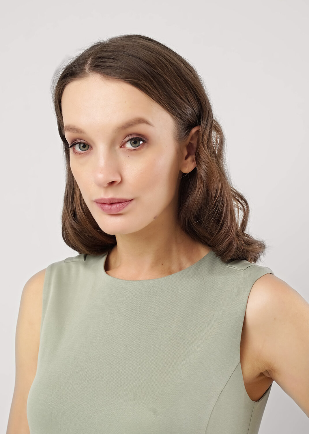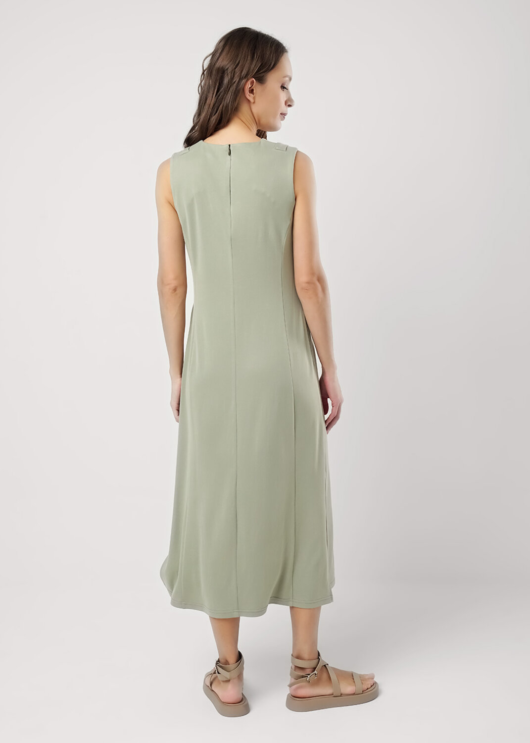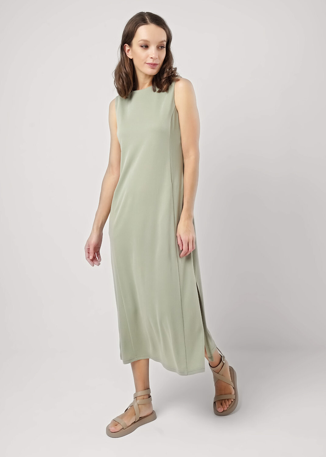 Платье из трикотажного полотна пике, без рукавов А-образного силуэта. Округлая горловина. По плечу хлястики.Спереди рельефы,боковые карманы в швах.На детали спинки средний шов с молнией, рельефы. По горловине и пройме внутренняя обтачка. Боковые разрезы.