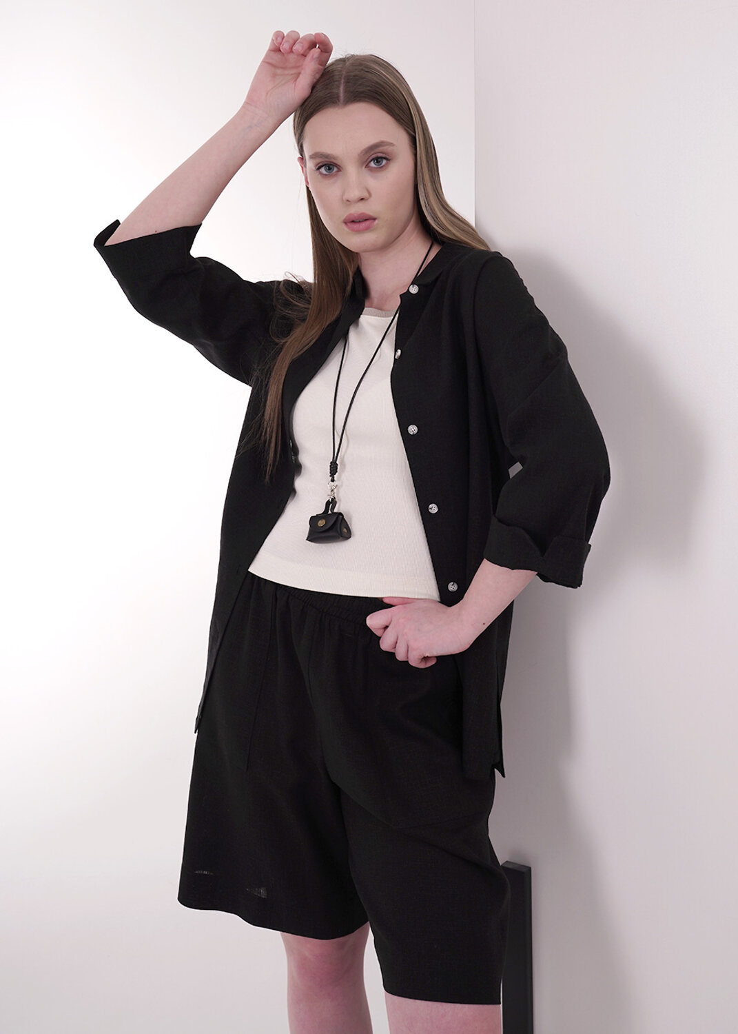 Блузка из текстильного полотна лен с вискозой,прямого силуэта. Длинный рукав со спущенной линией плеча, по низу манжет с разрезом. По борту цельновыкроенная планка с застежкой на пуговицы, по горловине отложной воротник со стойкой. По бокам разрезы.