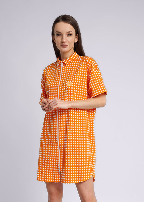 Платье-рубашка из трикотажного полотна с эффектом жатки. Застежка на молнию. Отложной воротник. Спущенная линия плеча. По бокам карманы. Застежка на молнию. На груди накладной карман и завершает дизайн жаккардовая нашивка.