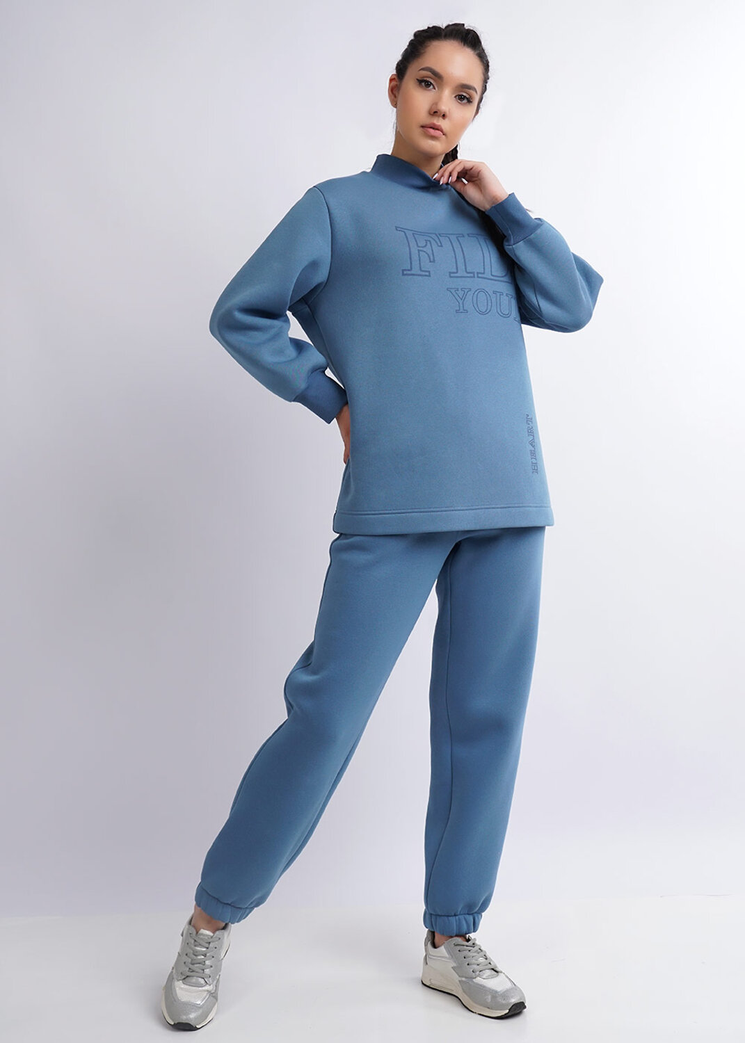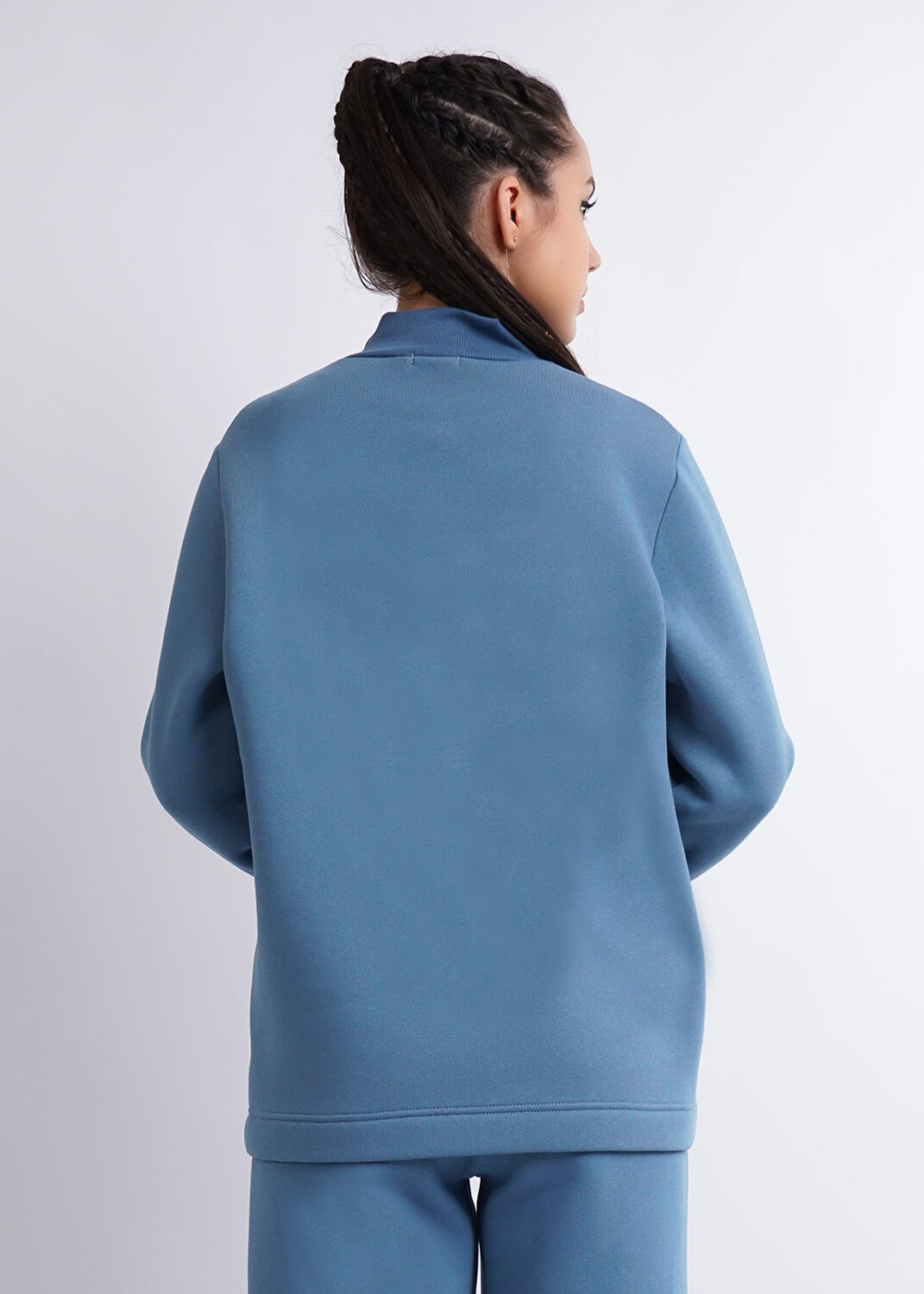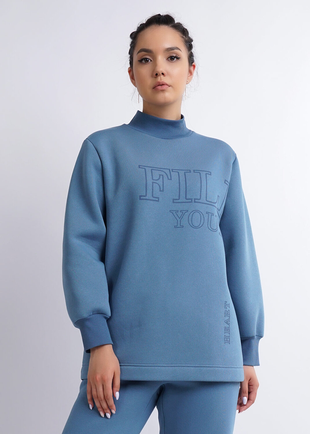 Толстовка из футера с начесом объёмная с втачным рукавом. Длинный рукав, низ которого обработан притачной манжетой из ткани кашкорсе . Горловина обработана высокой стойкой из кашкорсе. завершает дизайн крупный принт на детали переда.