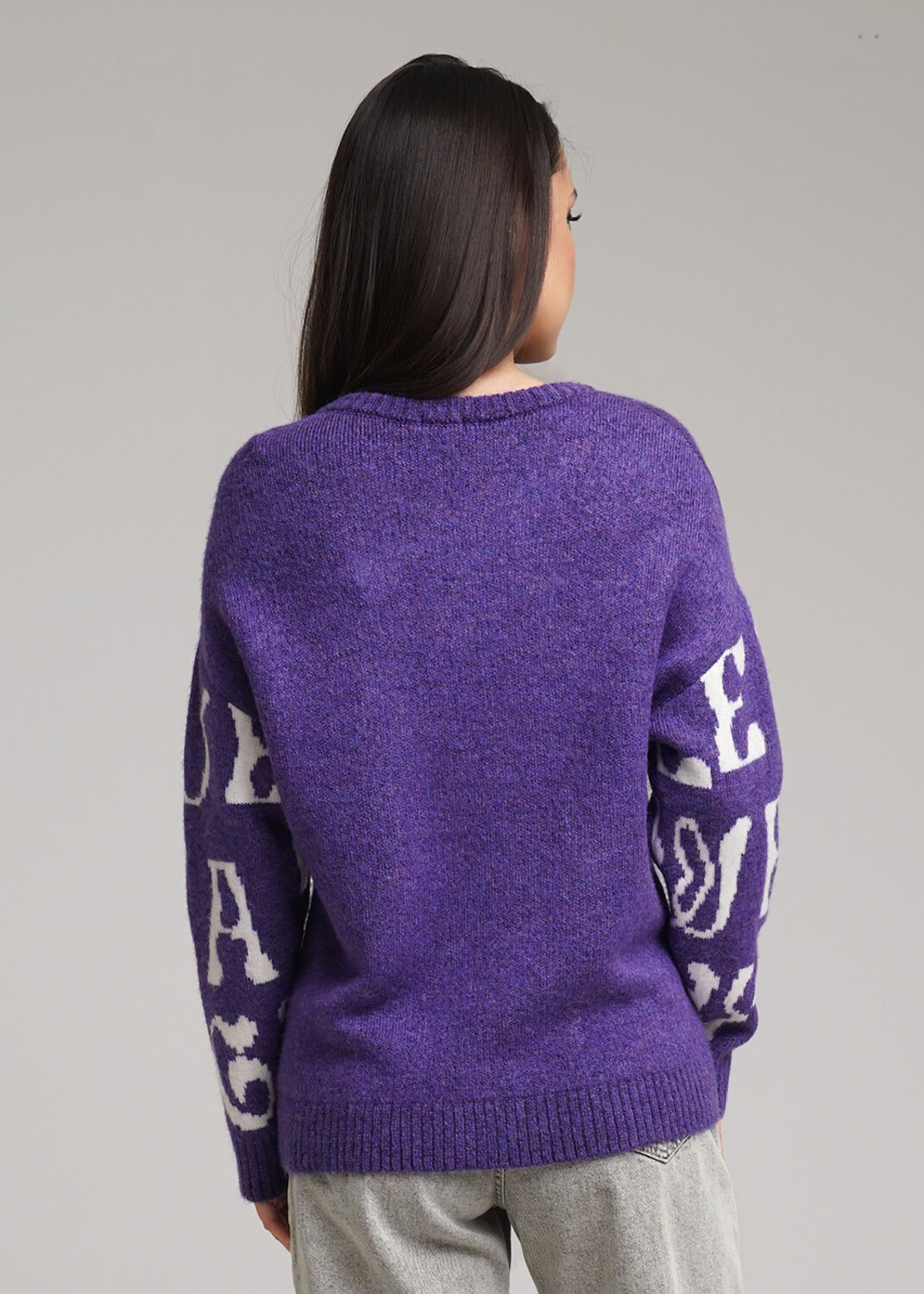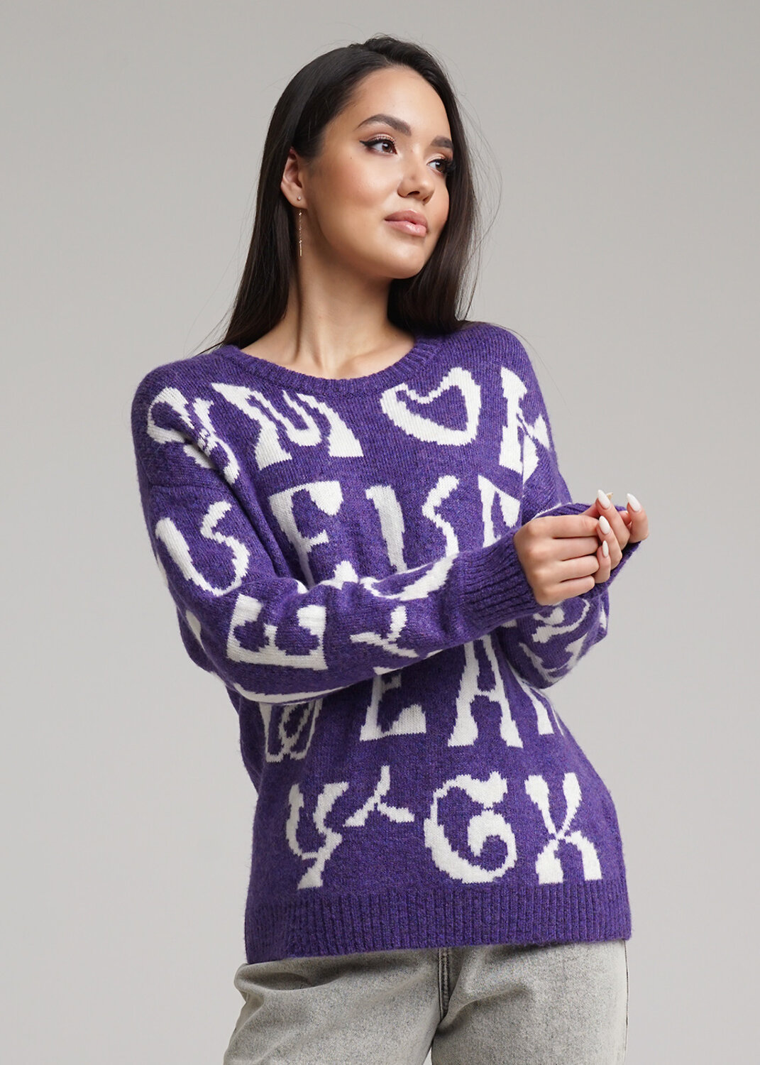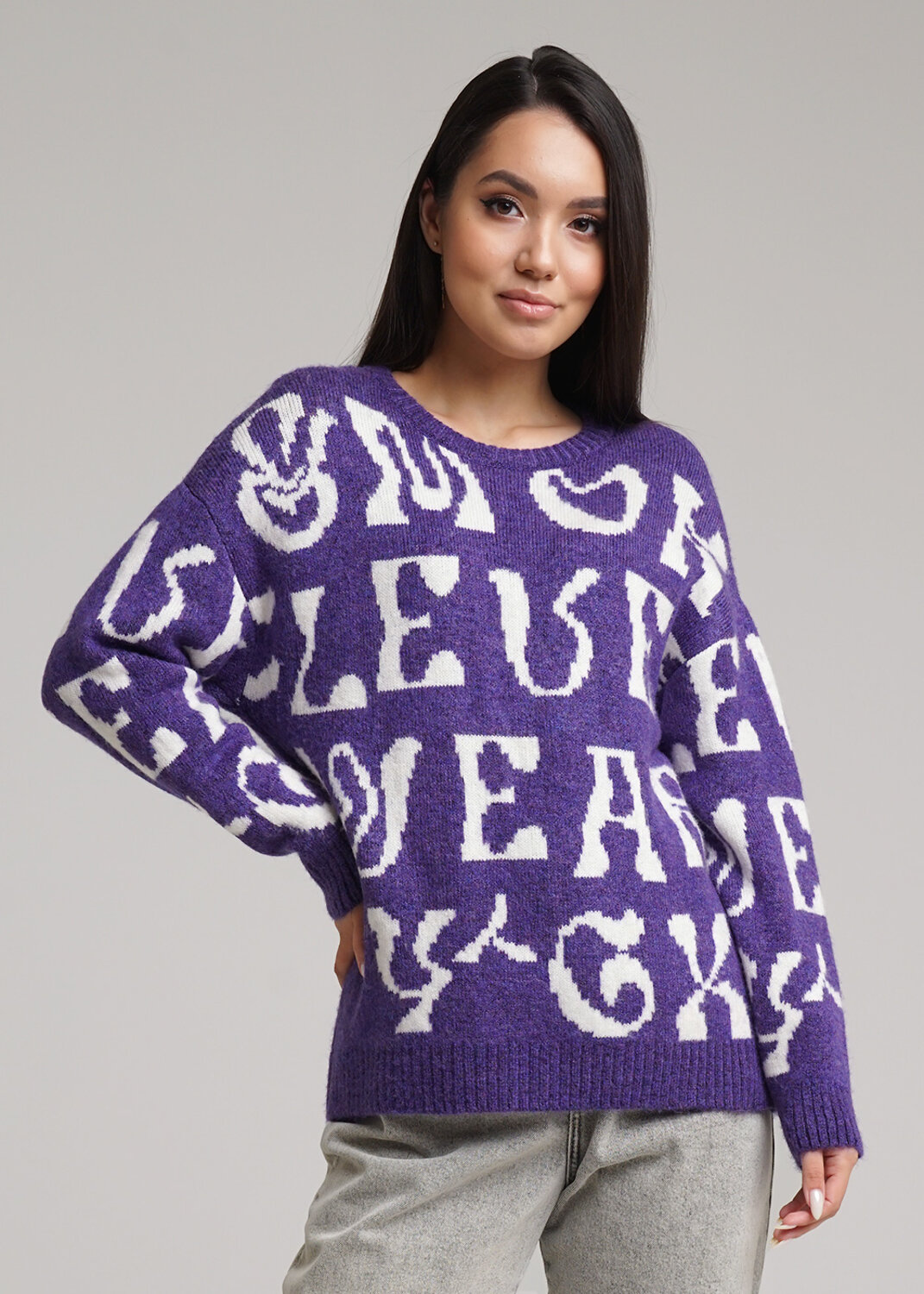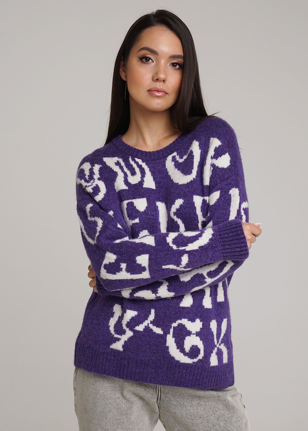 Вязаный джемпер из объемной фэшн пряжи. Длинный рукав со спущенной линией плеча. Круглый вырез горловины. По переду и рукавам жаккардовый рисунок.