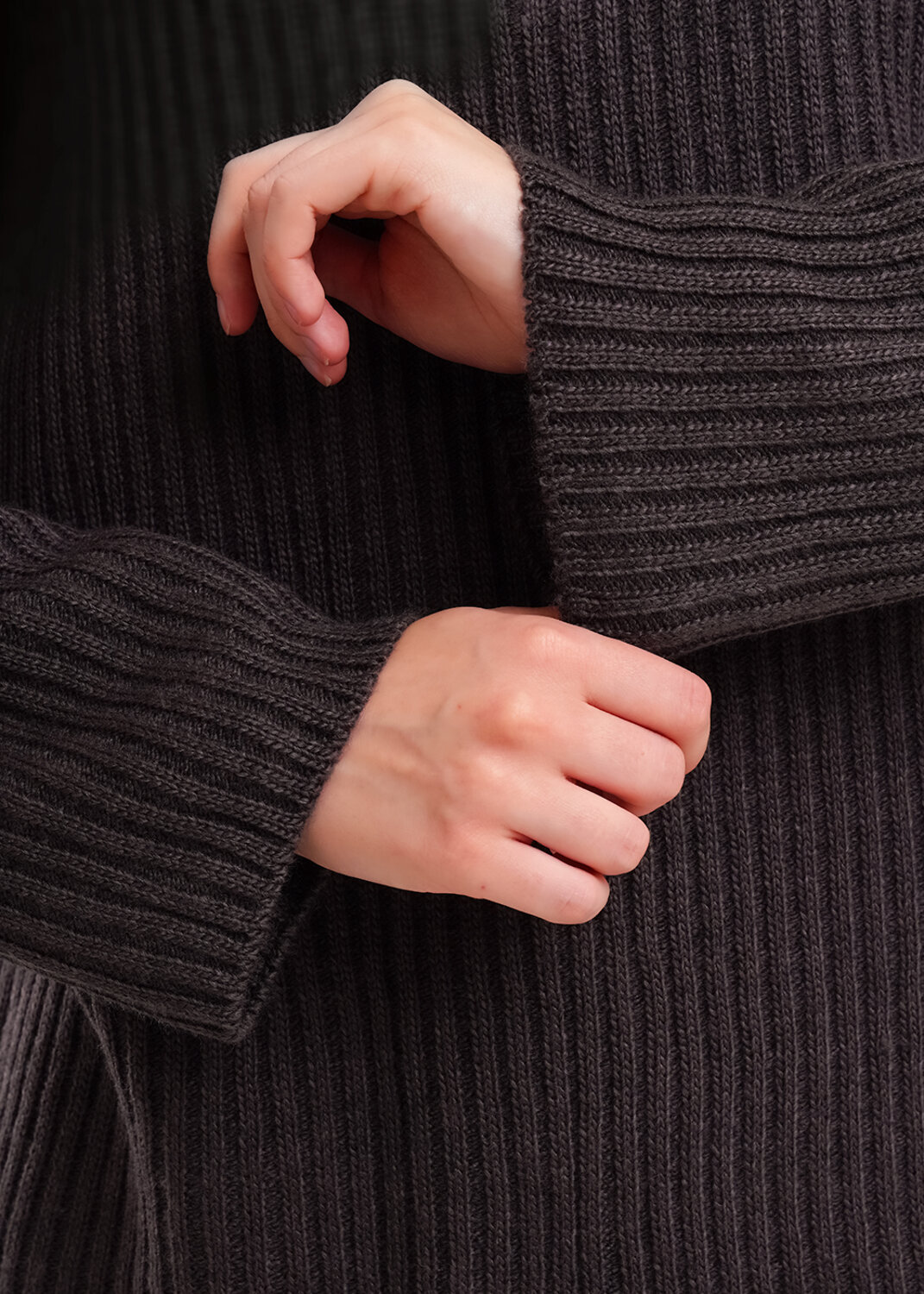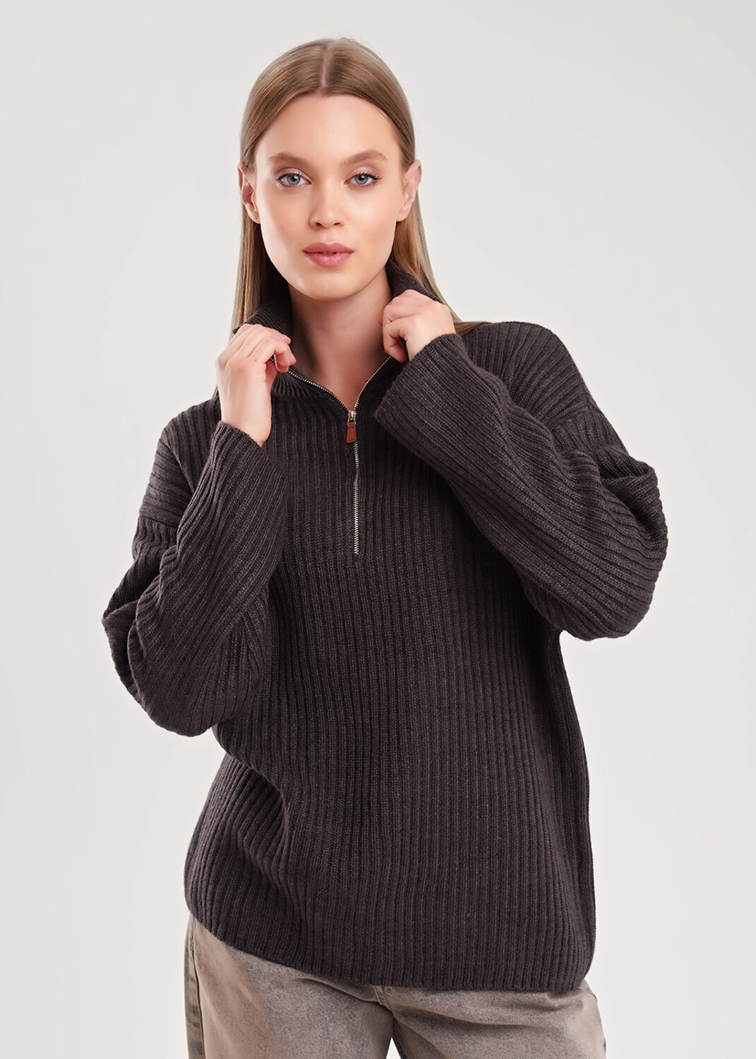Вязаный джемпер умеренного объема из акриловой пряжи с добавлением шерсти, переплетения полуфанг. Спущенный длинный рукав. По горловине стойка с застежкой на молнию.