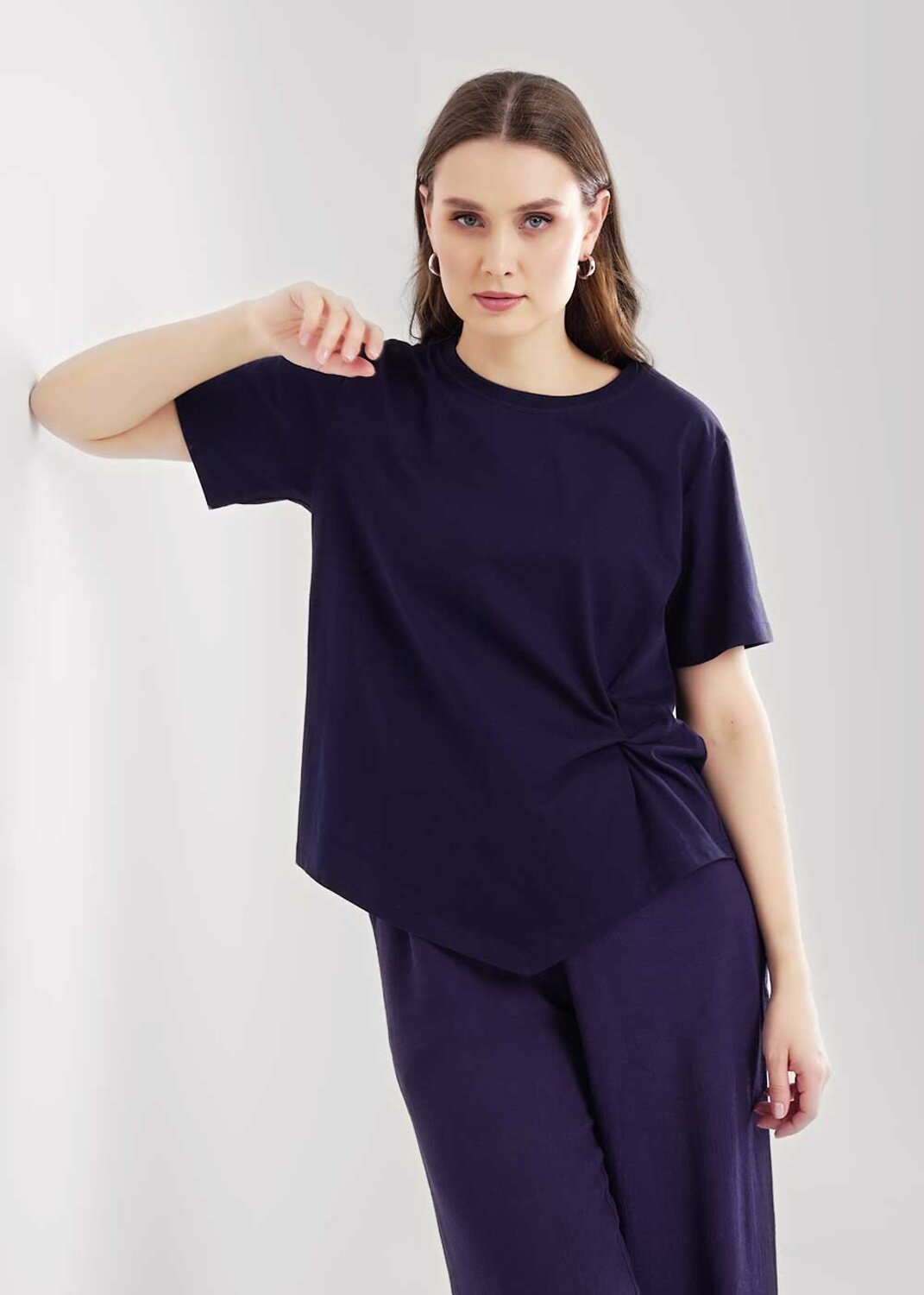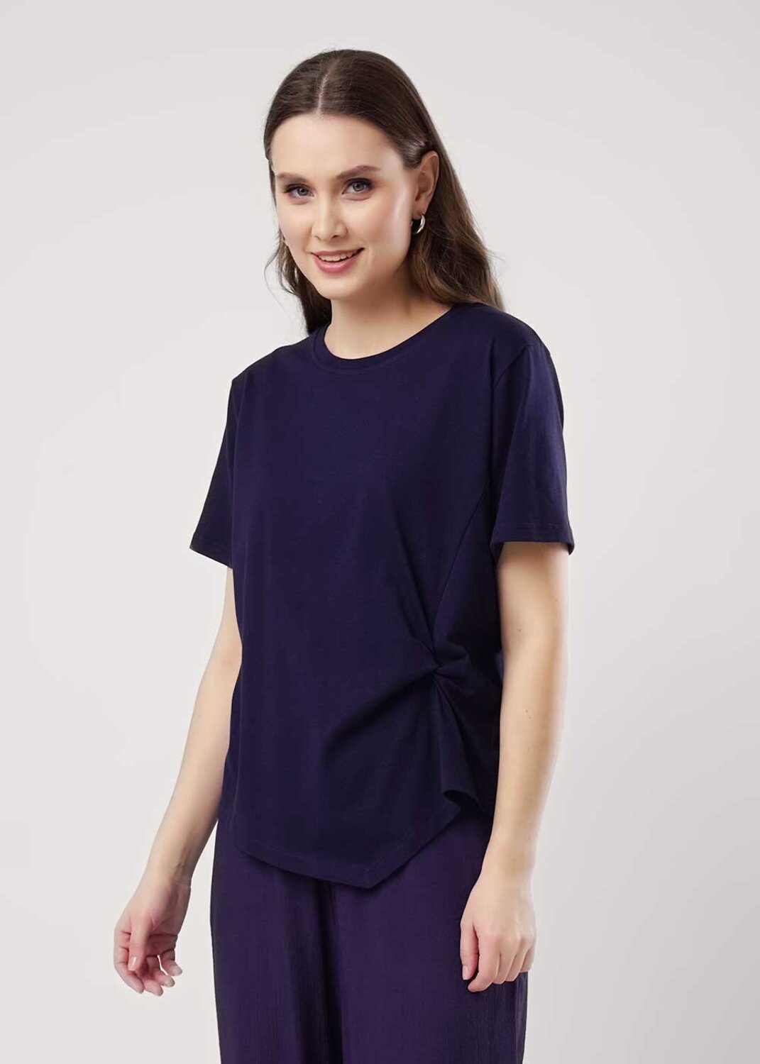 Джемпер прямого силуэта из хлопкового трикотажного полотна. Короткий втачной рукав. Округлая горловина с обтачкой. По переду декоративный узел. Фигурный низ изделия. На спинке принт вспенка.