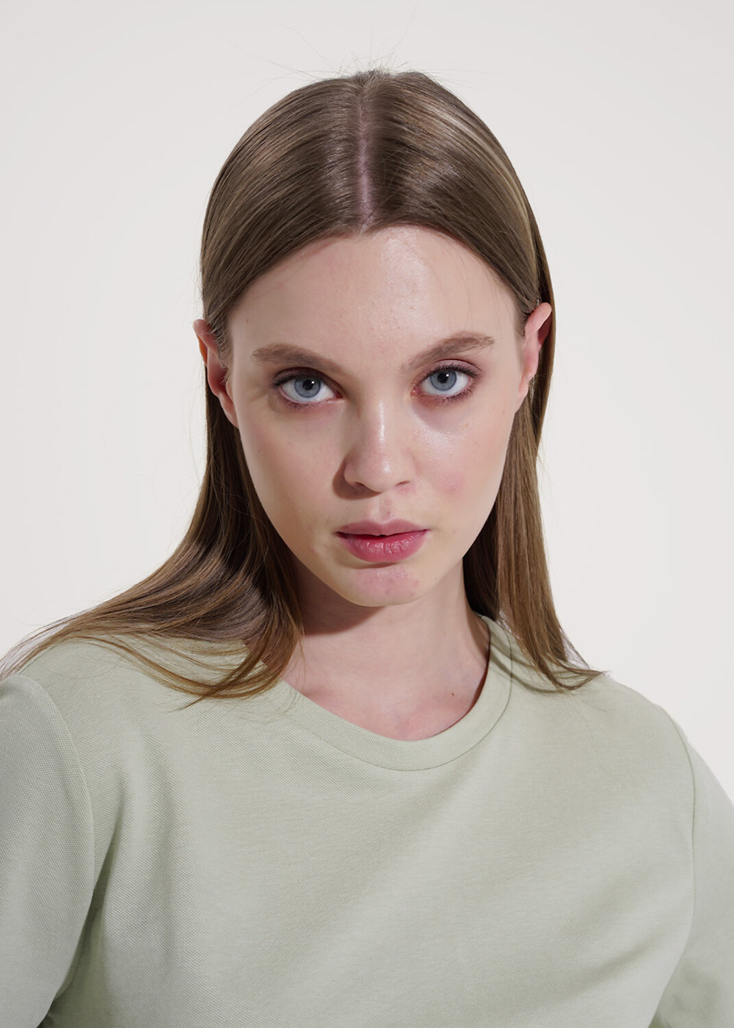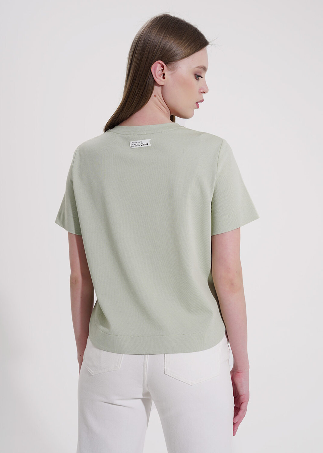 Джемпер из трикотажного полотна "пике", прямого силуэта. Втачной короткий рукав. Округлая горловина с обтачкой. Ассиметричный фигурный низ с обтачкой. На детали спинки нашивка.