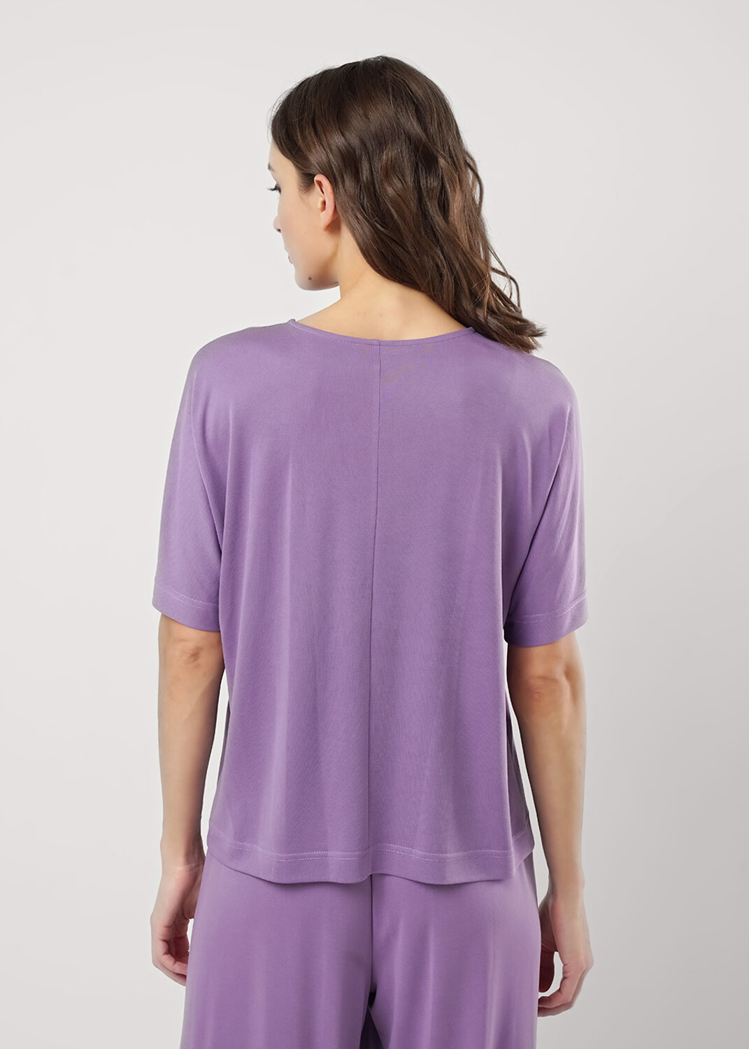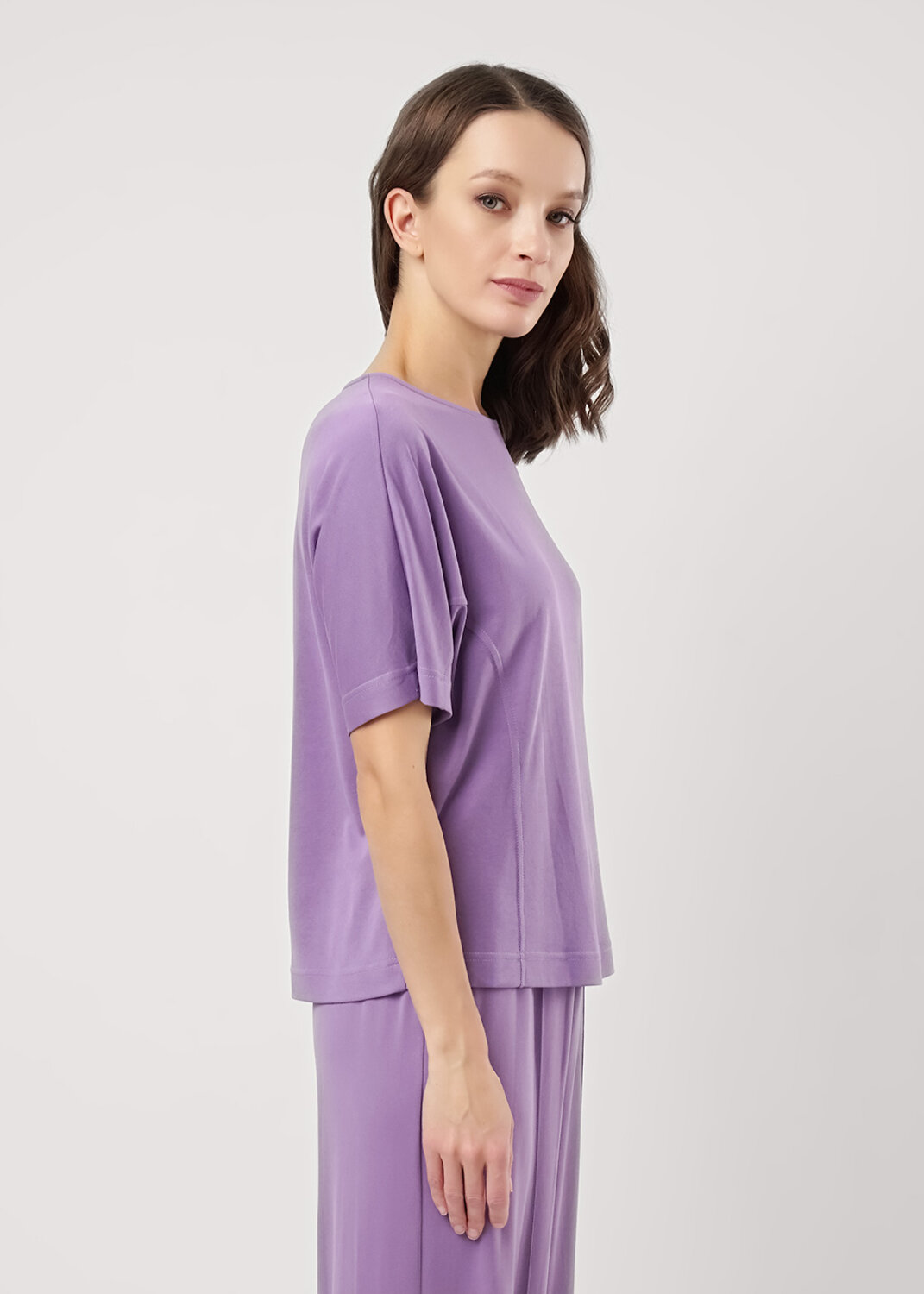 Джемпер прямого силуэта из вискозного трикотажного полотна пике. Короткий цельнокроеный рукав, спереди декоративные отстроченные резы. Округлая горловина с внутренней обтачкой. На спинке средний шов. Спереди нашивка металл.