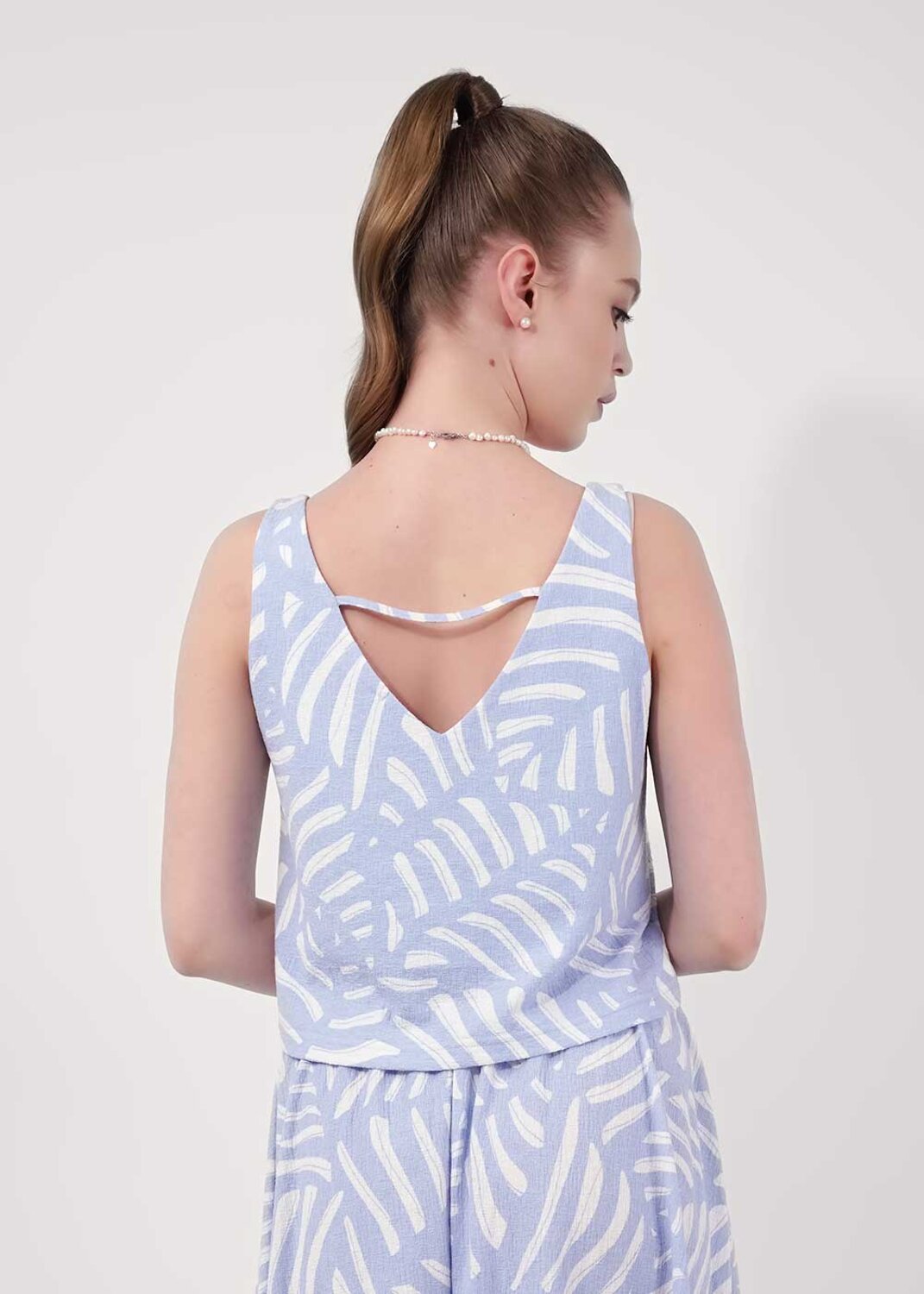 Джемпер без рукавов из фактурного трикотажного полотна джерси, среднее плечо. V-образный вырез грловины,по спинке узкая перемычка из окантовки. Перед и спинка двойные, спереди нашивка дерево.