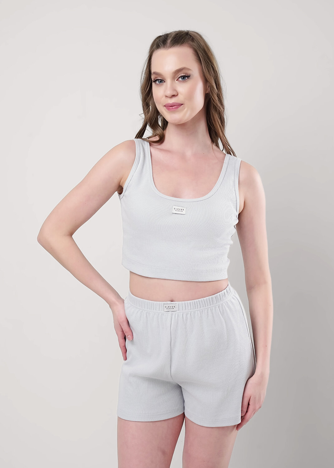 Пижама для дома из трикотажного полотна кашкорсе лапша. Майка укороченная. Узкая бретель. Округлый вырез горловины. По горловине и пройме окантовка.Спереди нашивка. По низу внутренняя резинка. Шорты прямого кроя, пояс на внутренней резинке, нашивка.