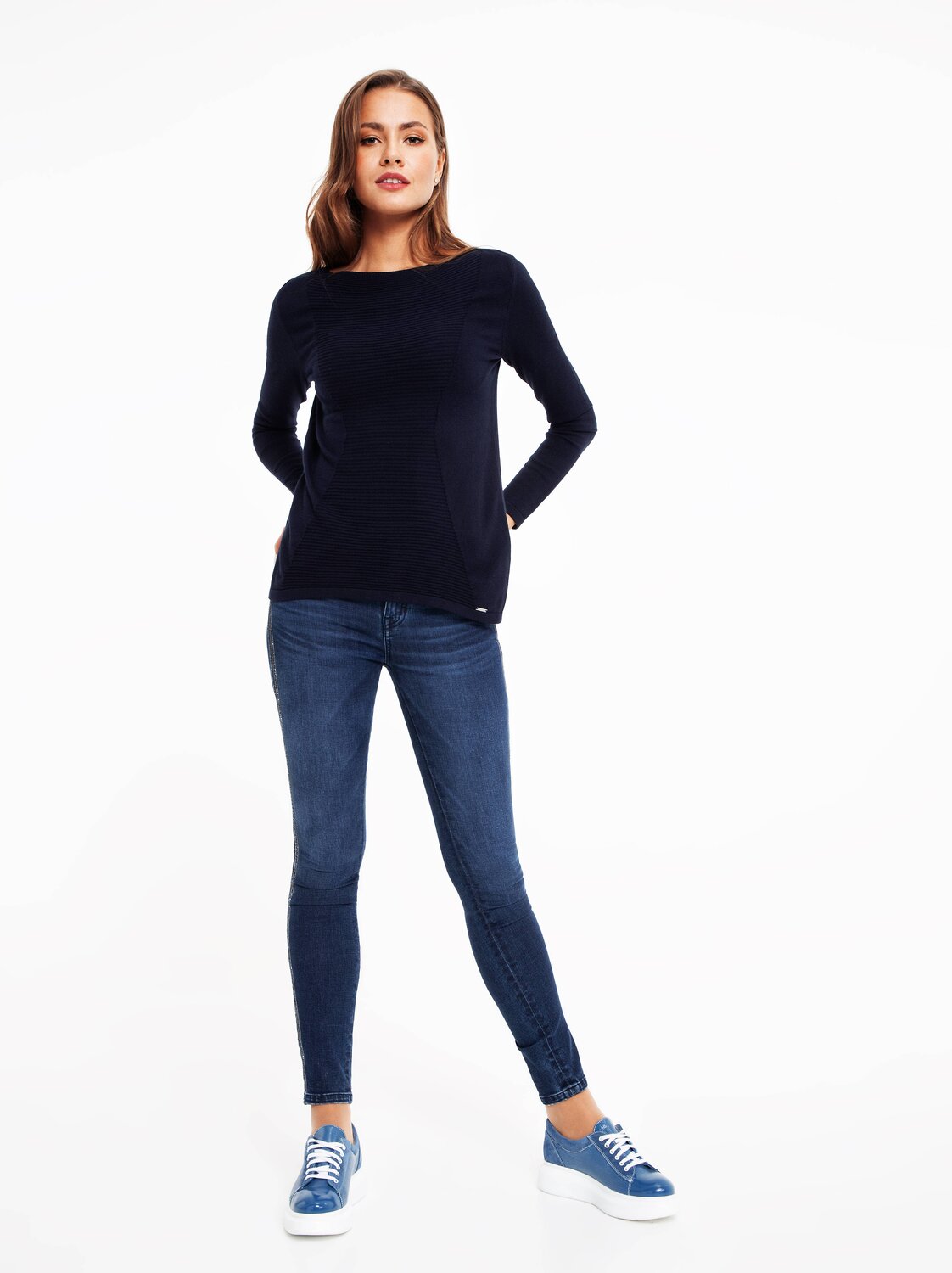 Стильный джемпер в классической цветовой гамме отлично подойдет под джинсы любого кроя, брюки и юбки.