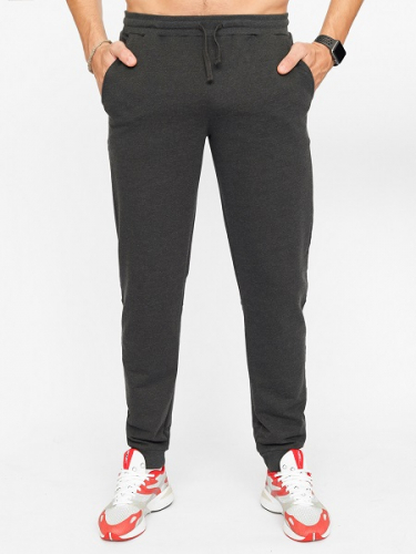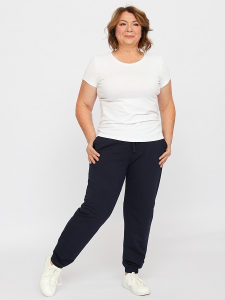 Футер без начеса, 72% хлопок, 20% полиэстер, 8% эластан / Брюки на широкой резинке по ножкам. Пояс отрезной из основного полотна, по поясу выполнена кулиска, шнур вставлен в петли. Карманы наклонные, с отстрочкой по входу в карман. Ниже кармана с левой стороны нашит металлический лэйбл со стразом. 1;1;1