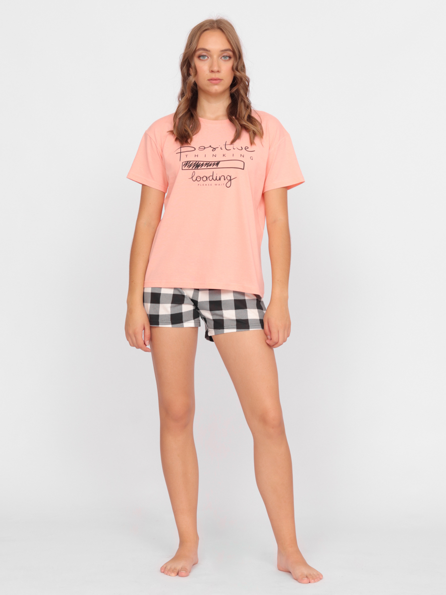 Кулирная гладь, 100% хлопок / Футболка однотонная, прямого свободного силуэта oversize длиной чуть выше бедер. Рукав короткий на спущенном плече. Круглая горловина обработана притачной обтачкой из рибаны с эластаном. На полочке выполнена шелкография мягкой краской. Шорты средней длины из набивки. 1;1;1;2;1;1;3;1