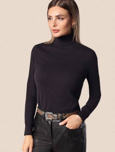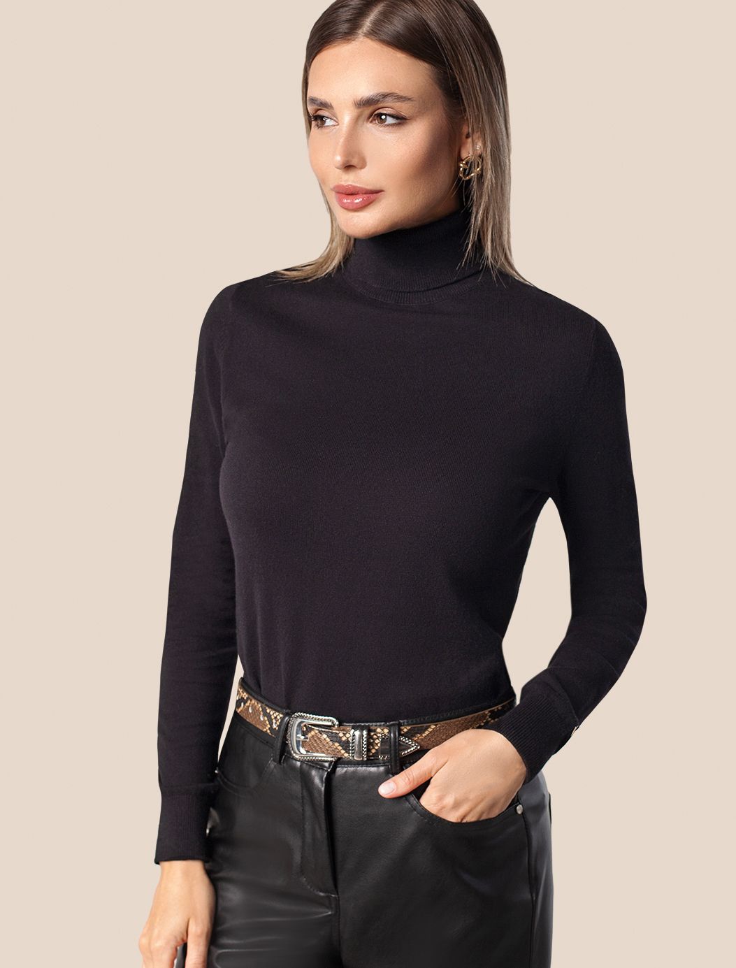 Водолазка тонкой вязки выполнена из мягкой хлопковой пряжи с нейлоном. Настоящий must have в любом гардеробе, изделие служит отличной базой в многослойных образах, сочетается с любым низом. Выгодная инвестиция в базовый демисезонный гардероб. Лаконичная модель дополнена металлическим логотип бренда.