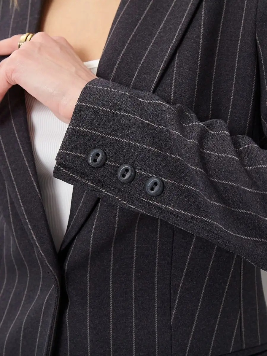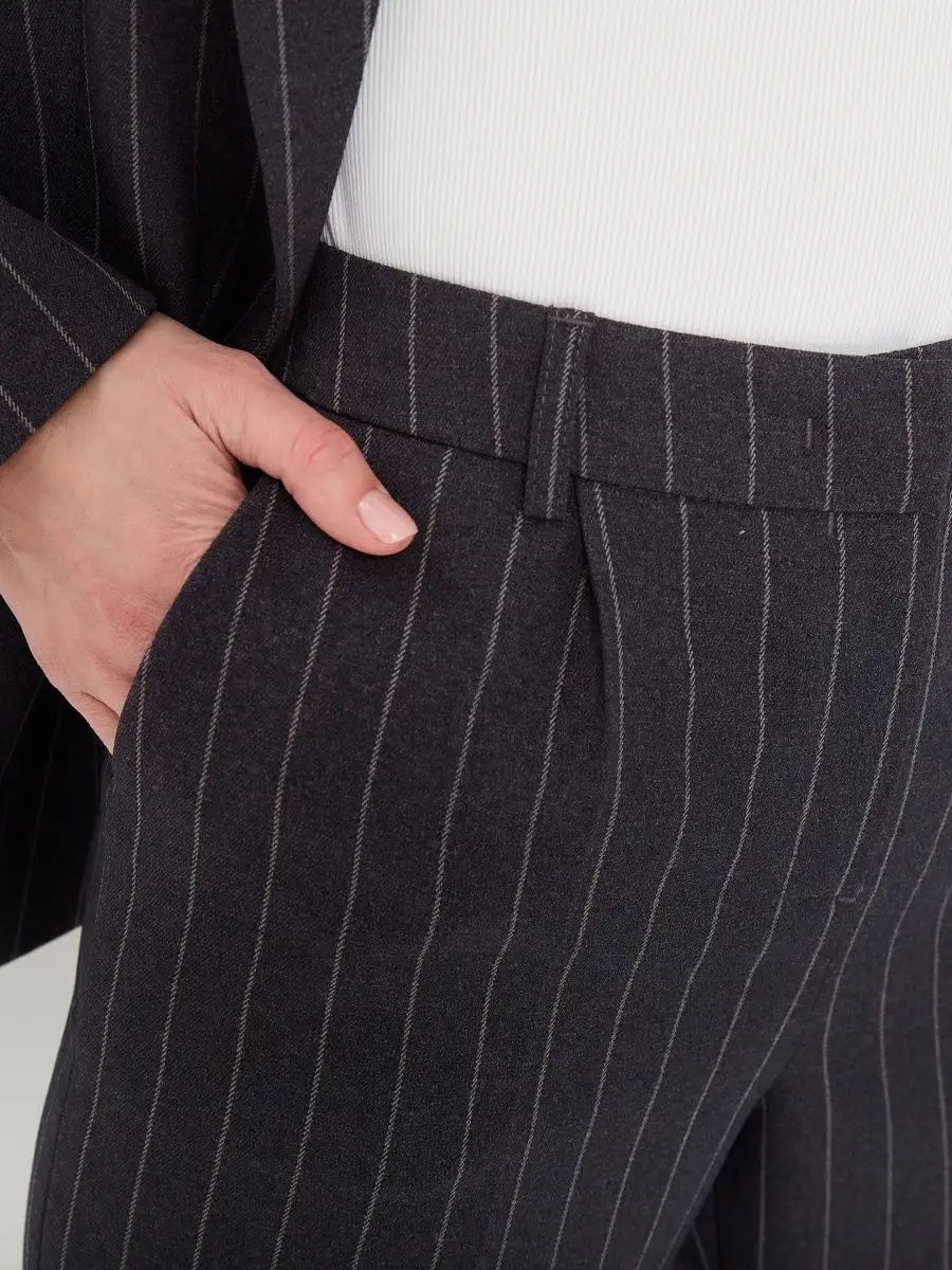 В сером оттенке этот комплект смотрится стильно и современно, сохраняя при этом классическую полоску, которая придает изысканности, позволяя создать премиальный образ.
