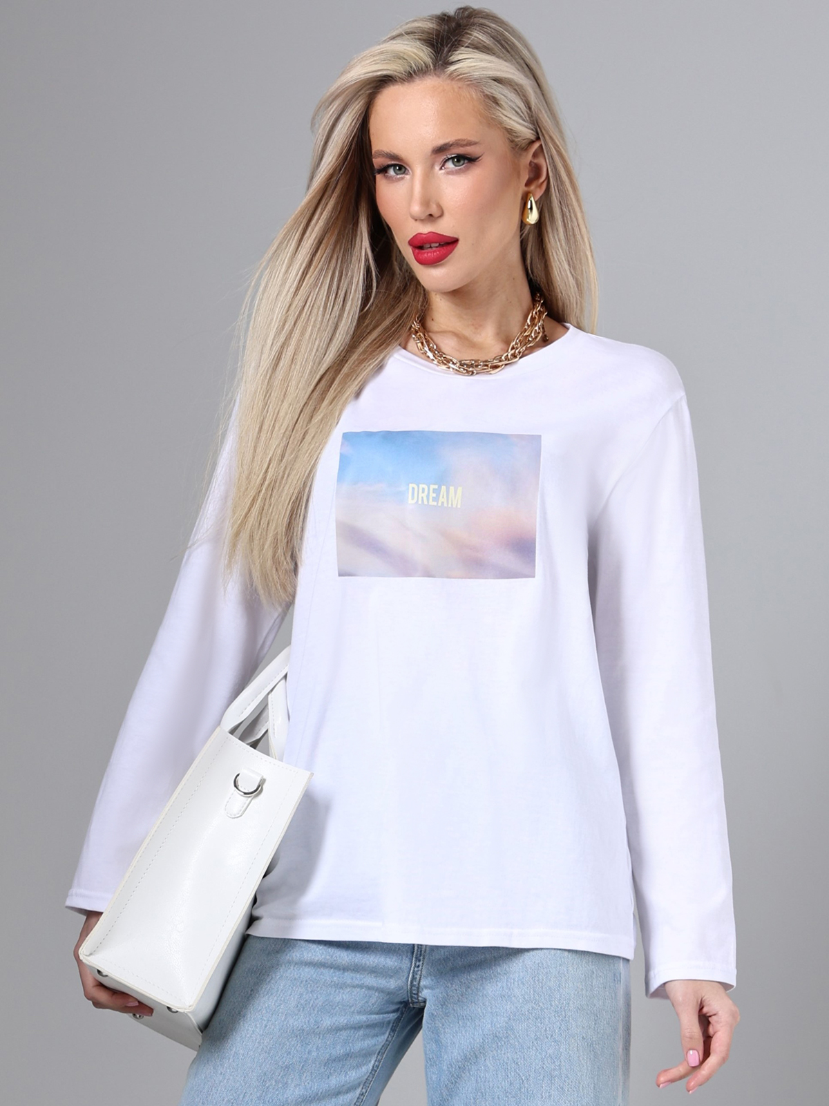 Стильный и удобный лонгслив идеально подойдет для демисезонного периода, обеспечивая комфорт и тепло. Лонгслив изготовлен из качественного трикотажа, выглядит стильно и эффектно. Базовый цвет модели позволит вам создавать яркие и запоминающиеся образы. Особенностью лонгслива является принт на груди. Длинные рукава придают образу легкость и воздушность. Сочетайте этот лонгслив с джинсами или брюками, и вы всегда будете выглядеть модно и актуально. Он прекрасно подойдет как для работы, так и для отдыха, и будет отличным дополнением к вашему гардеробу на прохладную погоду.