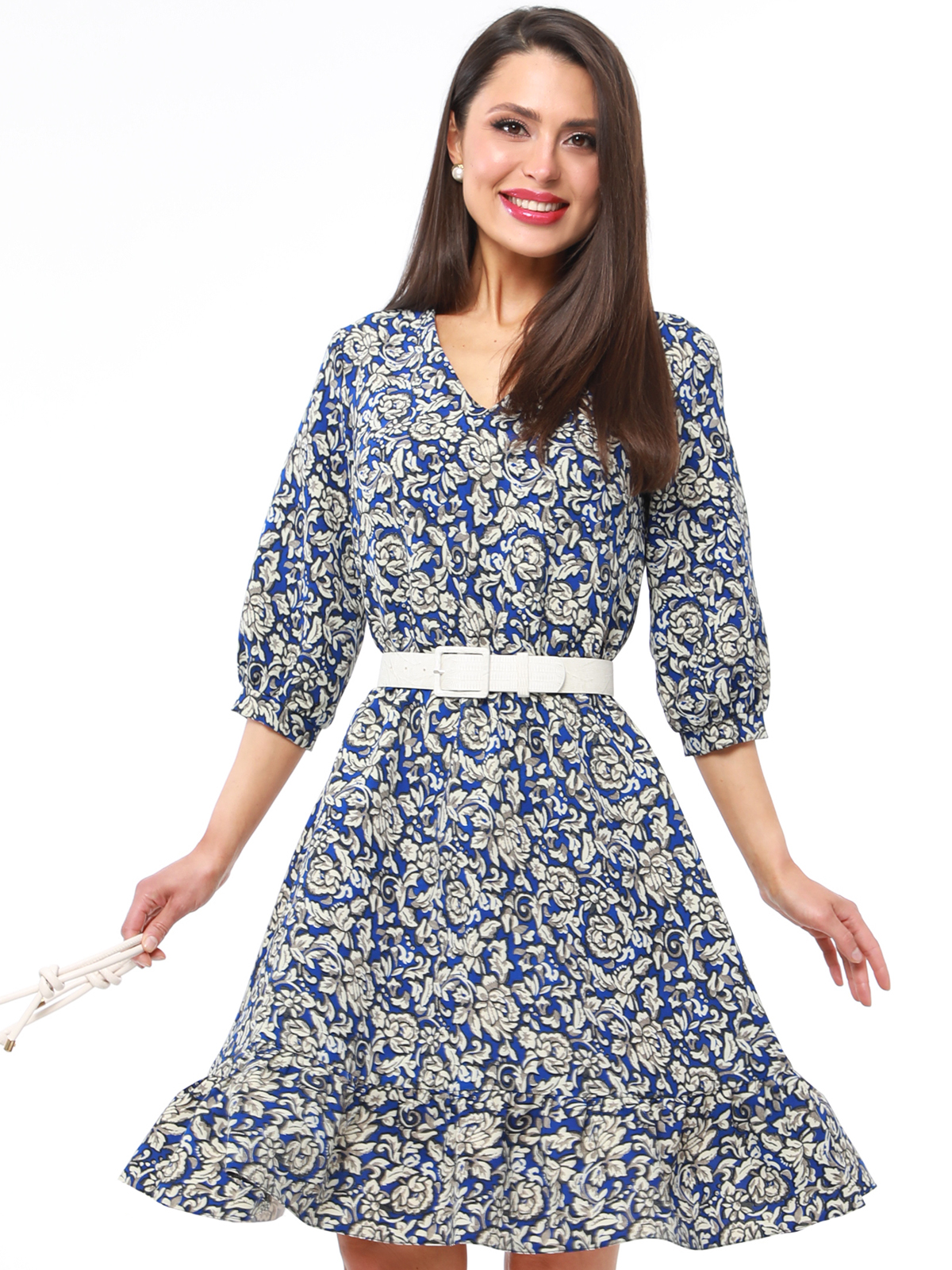 Летящее платье с воланом, V-образным вырезом горловины, пышными рукавами на манжете, актуальным геометрическим принтом и акцентным поясом подойдет практически для любой ситуации. Это может быть и ужин в ресторане, поход в кино или просто прогулка по парку.