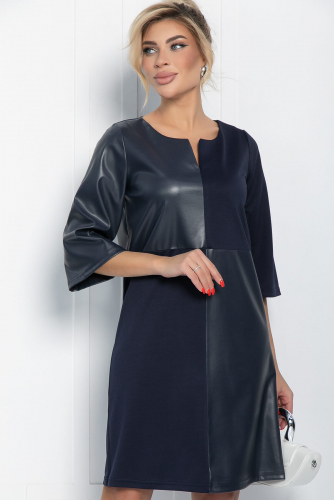 Стильное и удобное платье-трапеция, комбинированное вставками из кожи, выглядит красиво и привлекает внимание. Свободный крой модели позволяет скрыть недостатки фигуры. Рукав укороченный, цельнокроеный. Классическая длина вытягивает силуэт, поэтому подходит на любой рост. Комфортный крой платья позволяет надевать как на деловую встречу, так и на романтический вечер. Округлый вырез с V-образным элементом придает образу нежности и женственности.