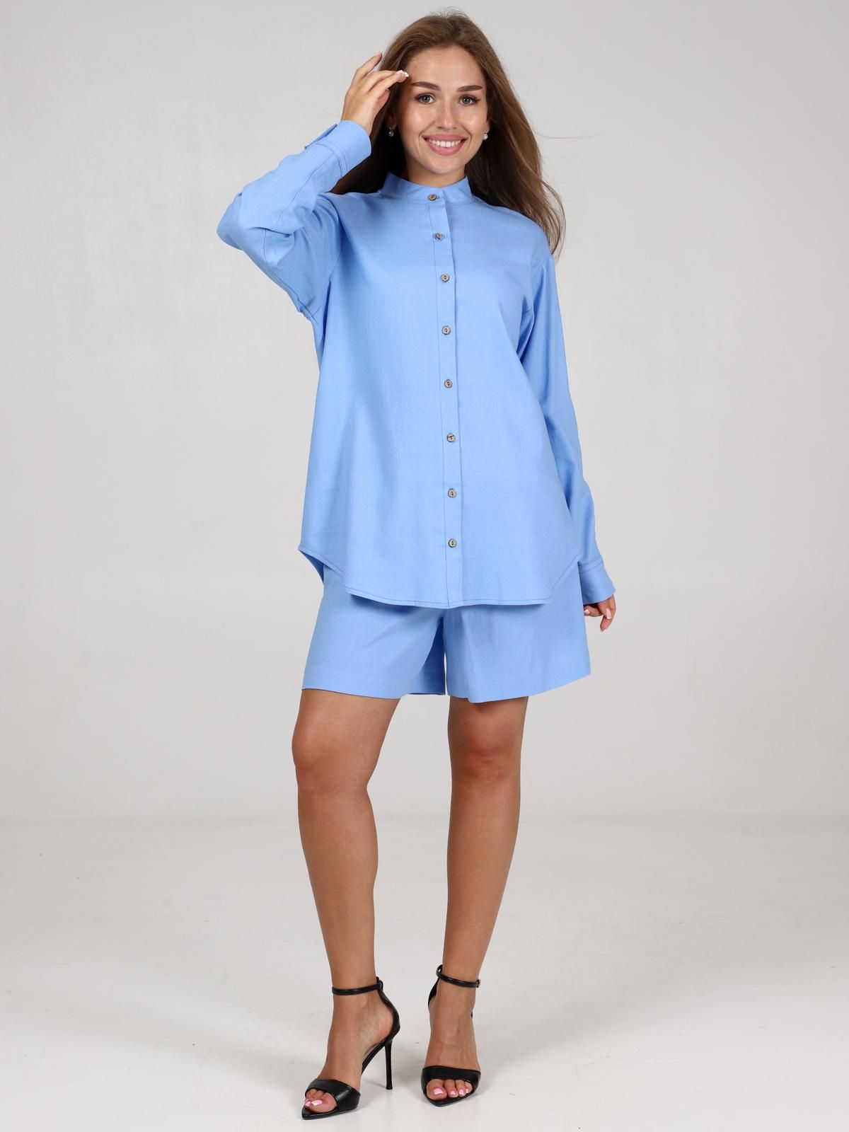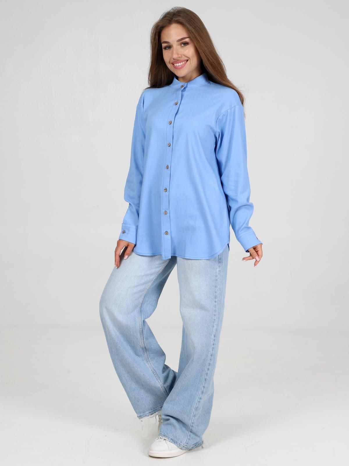 Женская рубашка умеренного объема. Воротник стойка. Полочка без вытачек. Застежка центральная с цельнокроеной планкой на обметанных петлях и пуговицах. Спинка с отрезной кокеткой. Рукав втачной, одношовный, рубашечного кроя. Нижний срез рукава оформлен притачной манжетой, застёгивающейся петли и пуговицы.