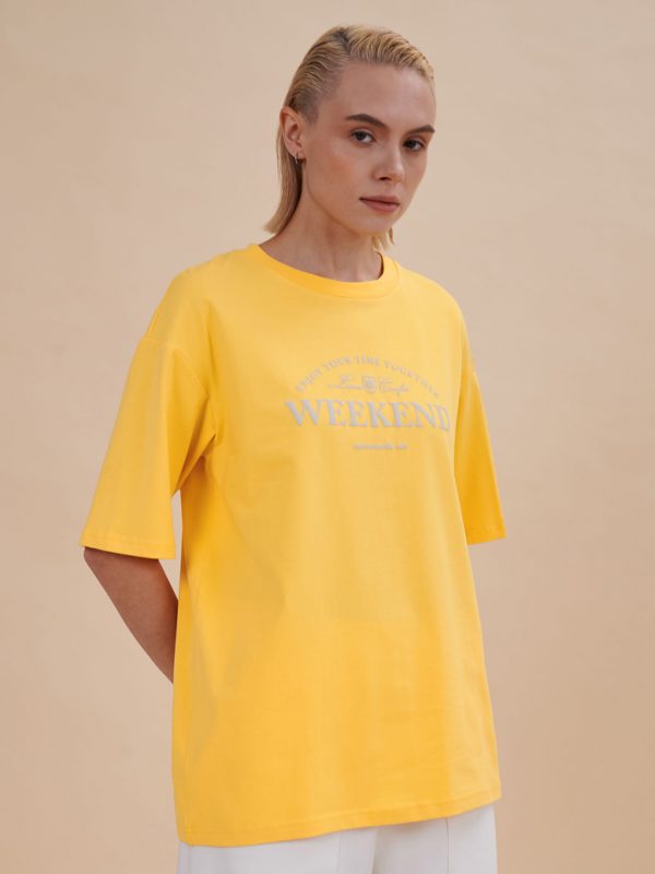 Состав: 95%хлопок 5%эластанОписание: Женская футболка с принтом. Футболка оверсайз со спущенным плечом подарит вам комфорт и свободу движения. Джемпер такого силуэта скрывает недостатки фигуры и подчёркивает достоинства. Майка с удлинёнными широкими рукавами — один из актуальных модных трендов сезона. Она неприхотлива в уходе. Трикотажная футболка украшена трендовым принтом в университетском стиле по переду, надписи переводится: "наслаждайтесь временем, проведённым вместе", "досуг, комфорт", "выходные на объединяют". Принт качественный и стойкий — без проблем переносит многочисленные стирки. В составе ткани преобладает высококачественный хлопок — футболка мягкая, приятная на ощупь и позволяет коже дышать. Эластан помогает изделию надолго сохранить первозданную форму. Джемпер представлен в следующих актуальных цветах: чёрный, голубой, синий, жёлтый, белый, зелёный, бежевый. Размерная линейка: XS (42): S (44): M (46): L (48): XL (50). Модель идеальна и для женщин, и для девушек, и для девочек-подростков. Базовая футболка оверсайз универсальна, отлично подходит для работы, учёбы, спорта, прогулок, отдыха, а также для дома и сна. Хлопковая футболка легко сочетается с различными брюками и шортами. Её можно носить летом, зимой и в демисезон (осенью и весной). Модная футболка— это прекрасный подарок сестре, подруге или маме на любой праздник. Выбирайте нужный размер по таблице размеров на фото. Цвет товара на экране вашего устройства может отличаться от цвета изделия вживую.