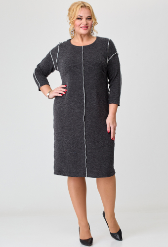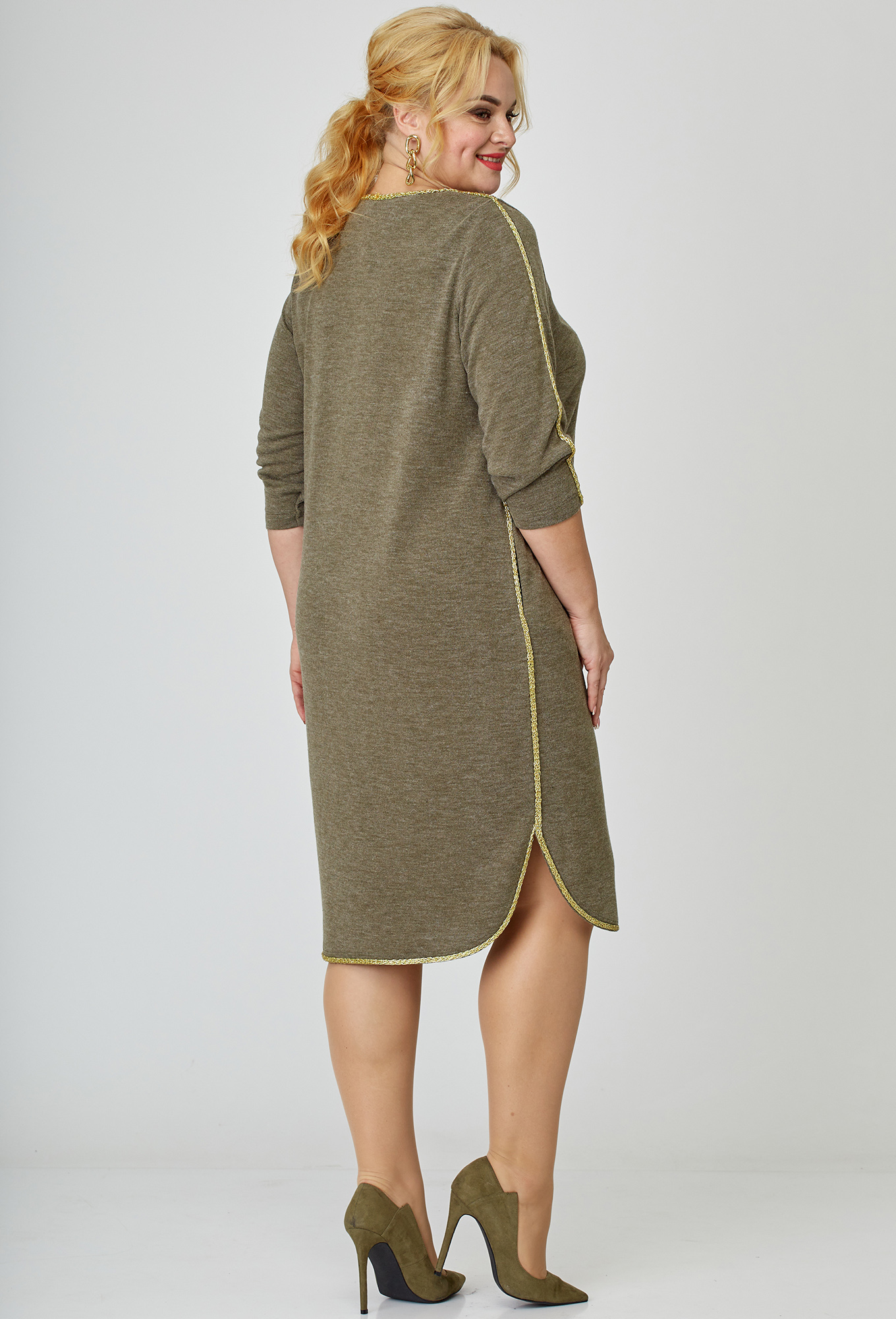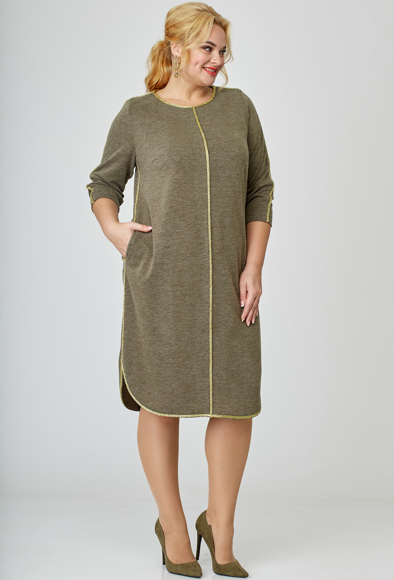 Платье женское,полуприлегающего силуэта. По переду средний шов, нагрудные вытачки, в боковых швах обработаны карманы. Рукав втачной одношовный. Низ платья закруглённый. В качестве отделки используется шнур: на горловине, плечевых, проймах, боковых и рукавах.