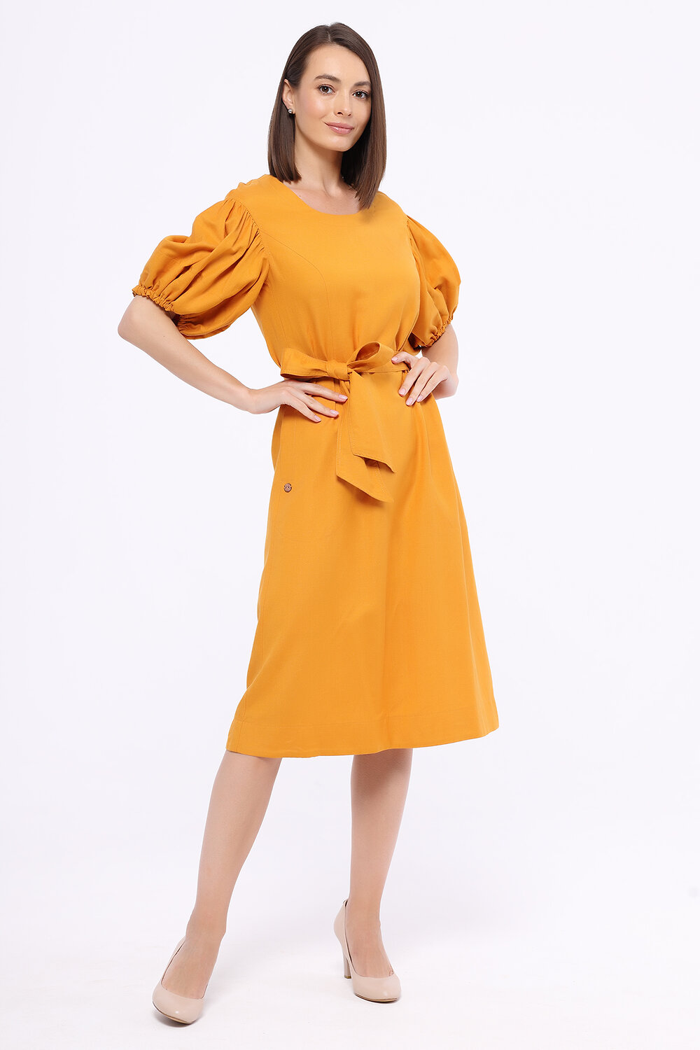 Полуприлегающее платье с круглым вырезом из нтуральной смесовой ткани с рельефами по груди, карманами в боковых швах и дизайнерскими романтичными рукавами. Пояс в комплекте.