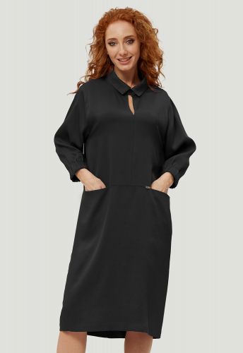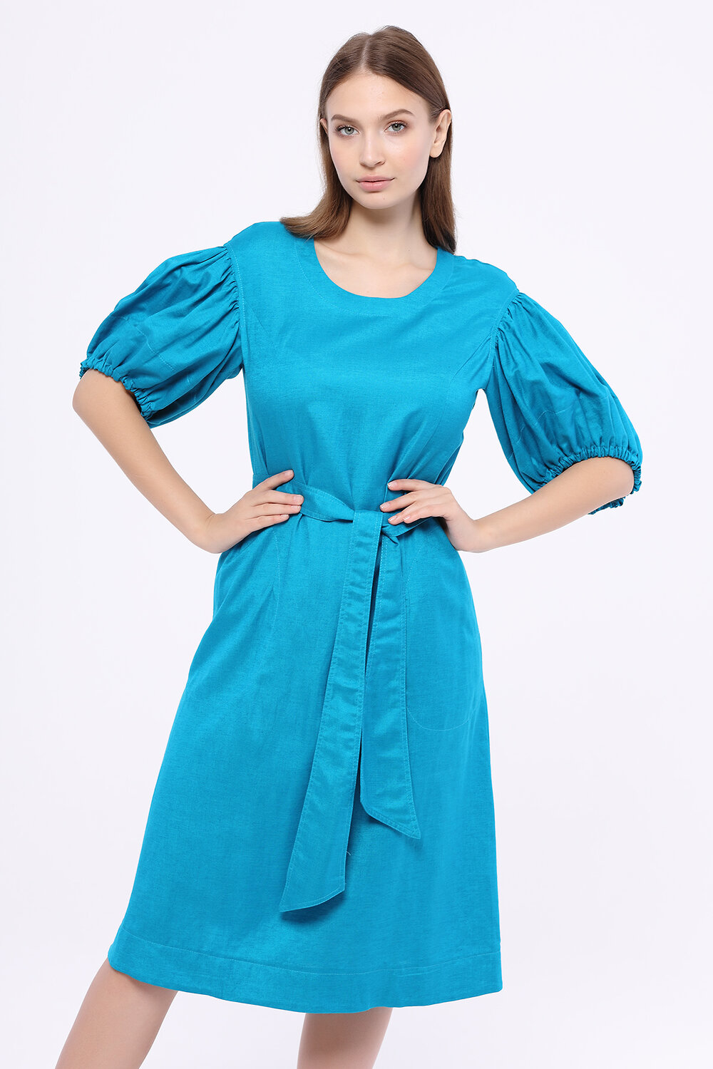 Полуприлегающее платье с круглым вырезом из нтуральной смесовой ткани с рельефами по груди, карманами в боковых швах и дизайнерскими романтичными рукавами. Пояс в комплекте.