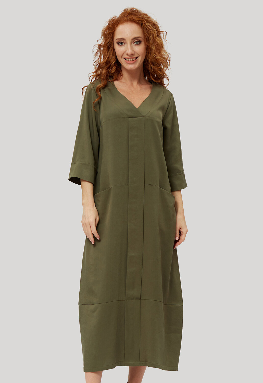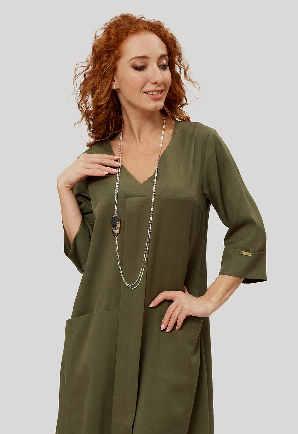Стильное, универсальное платье в минималистическом кэжуал - стиле комфортной длины от российского производителя D’imma Fashion Studio из натуральной ткани - олицетворение женственности, привлекательности и уверенности. Модель на кокетке с актуальным V-образным вырезом, визуально удлиняющим шею. Вырез обработан широкой обтачкой, переходящей в бантовую складку по центру переда. Втачной рукав с цельнокроеной манжетой делает его интересным и модным. По переду горизонтальный рез ниже линии талии с цельнокроеными карманами придаст модели удобства и стиля. Данное платье свободного силуэта будет изумительно смотреться не только на моделях из дизайнерских коллекций, но и на корпулентных девушках. Можно дополнять яркими аксессуарами и менять образ под настроение. Модель создана для тех, кто любит быть индивидуальным и неповторимым.