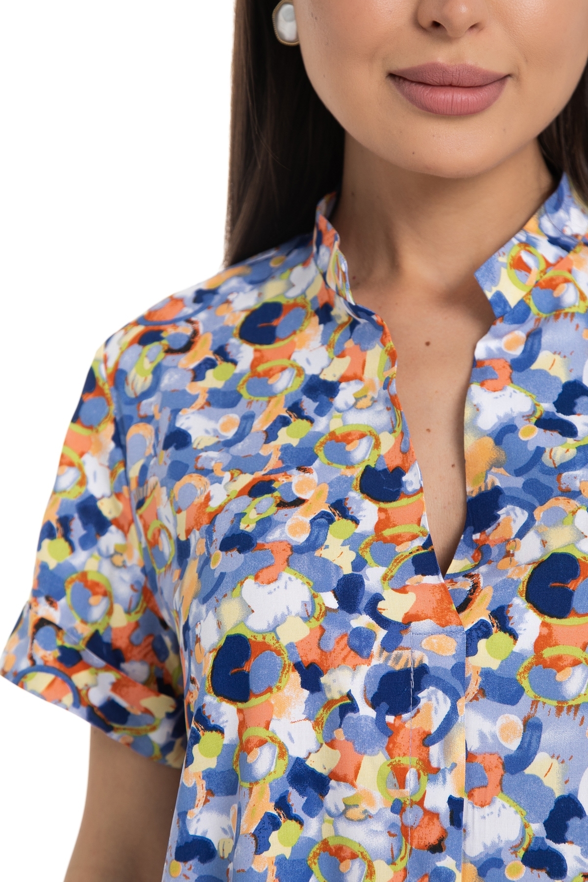 Блузка  продуманного и универсального фасона, идеально подходящего под любой низ. Блуза летних расцветок, идеально впишется в любой гардероб: для создания , повседневного или праздничного. Можно носить как с классическими брюками и юбками, так и с джинсами или под сарафан. Прекрасно смотрится как в заправленном состоянии, так и на выпуск. Благодаря вискозной ткани блузка обеспечивает идеальный  комфорт в летний зной, не мнется и обладает износостойкостью, Ткань легкая и не просвечивает. Воротник классический на стойке, рукав короткий   с отворотом.