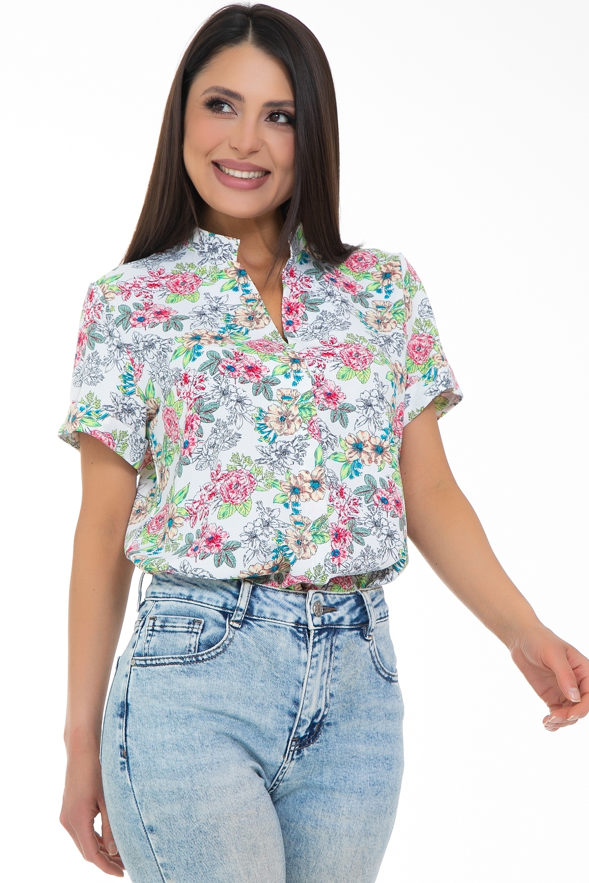 Блузка  продуманного и универсального фасона, идеально подходящего под любой низ. Блуза летних расцветок, идеально впишется в любой гардероб: для создания , повседневного или праздничного. Можно носить как с классическими брюками и юбками, так и с джинсами или под сарафан. Прекрасно смотрится как в заправленном состоянии, так и на выпуск. Благодаря вискозной ткани блузка обеспечивает идеальный  комфорт в летний зной, не мнется и обладает износостойкостью, Ткань легкая и не просвечивает,  рукав короткий  с отворотом.