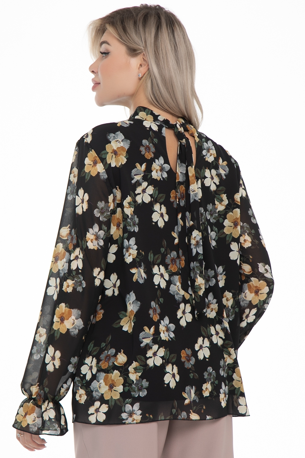 Шифоновая блузка с авторским принтом – настоящая находка для всех модниц! Утонченный благородный дизайн делает ее идеальным выбором для любого особого случая. Легкая, с изящным воротником стойкой, широкие объемные пышные рукава- все это превращает  повседневный образ в необычный и оригинальный. В этой красивой блузе из шифона вы всегда будете выглядеть потрясающе! Прямая свободная блуза с идеальной посадкой на любую фигуру, ее легко сочетать с брюками, джинсами или юбкой, надевать под пиджак или жакет. Воротник стойка сзади переходит в завязки с длинными концами, из которых получается великолепный бант. Можно сделать свободный узел и оставить ленты, либо перекинуть их вперед, создав тем самым новый образ. Рукав длинный, на резинке с красивой рюшей по низу.