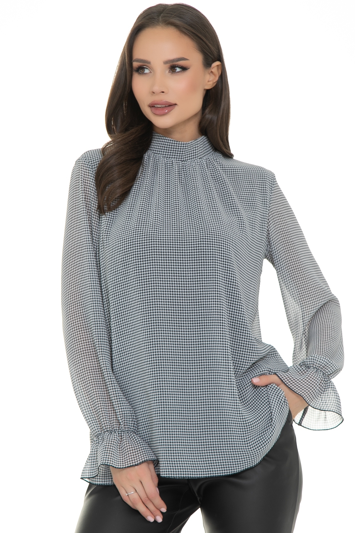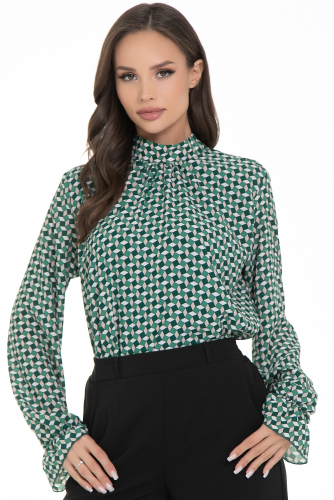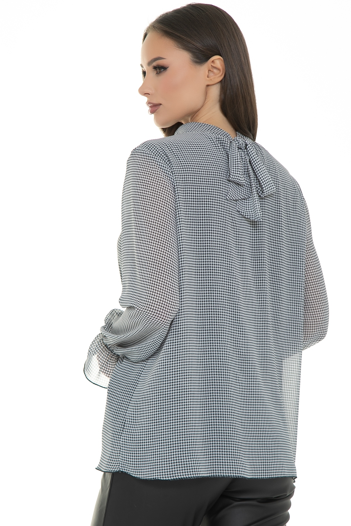 Шифоновая блузка с авторским принтом – настоящая находка для всех модниц! Утонченный благородный дизайн делает ее идеальным выбором для любого особого случая. Легкая, с изящным воротником стойкой, широкие объемные пышные рукава- все это превращает  повседневный образ в необычный и оригинальный. В этой красивой блузе из шифона вы всегда будете выглядеть потрясающе! Прямая свободная блуза с идеальной посадкой на любую фигуру, ее легко сочетать с брюками, джинсами или юбкой, надевать под пиджак или жакет. Воротник стойка сзади переходит в завязки с длинными концами, из которых получается великолепный бант. Можно сделать свободный узел и оставить ленты, либо перекинуть их вперед, создав тем самым новый образ. Рукав длинный, на резинке с красивой рюшей по низу.