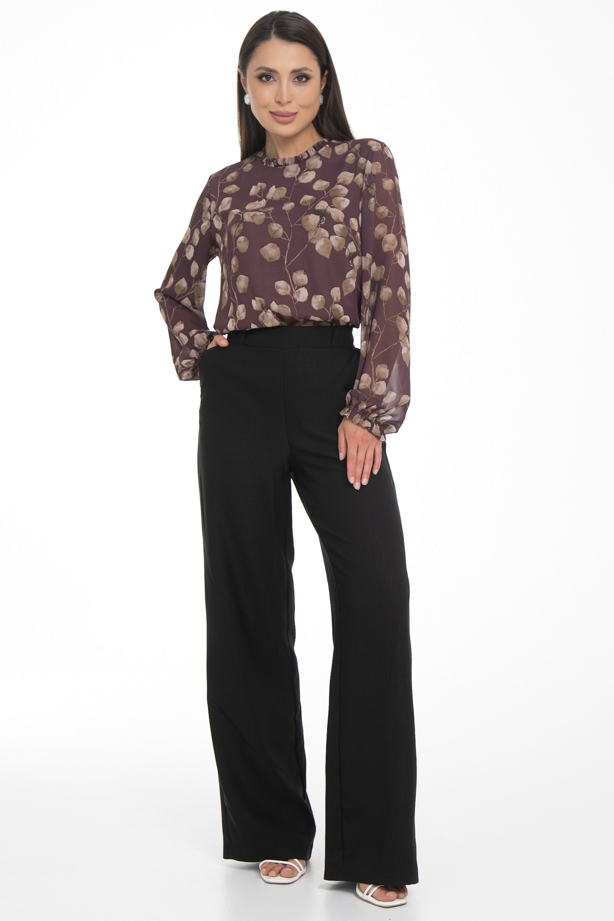 Очаровательная свободная шифоновая блузка, подчеркивающее женственность - отличное решение на каждый день или на праздник для современной стильной женщины. Шикарная модель с объемными длинными рукавами выполнена из высококачественного шифона. Круглая горловина оформлена рюшей с застежкой на пуговицу на спине.Нежная блузка из шифона на трикотажном подкладе, по переду сделаны вытачки на грудь, рукава втачные пышные, длинные, снизу собраны на резинку.