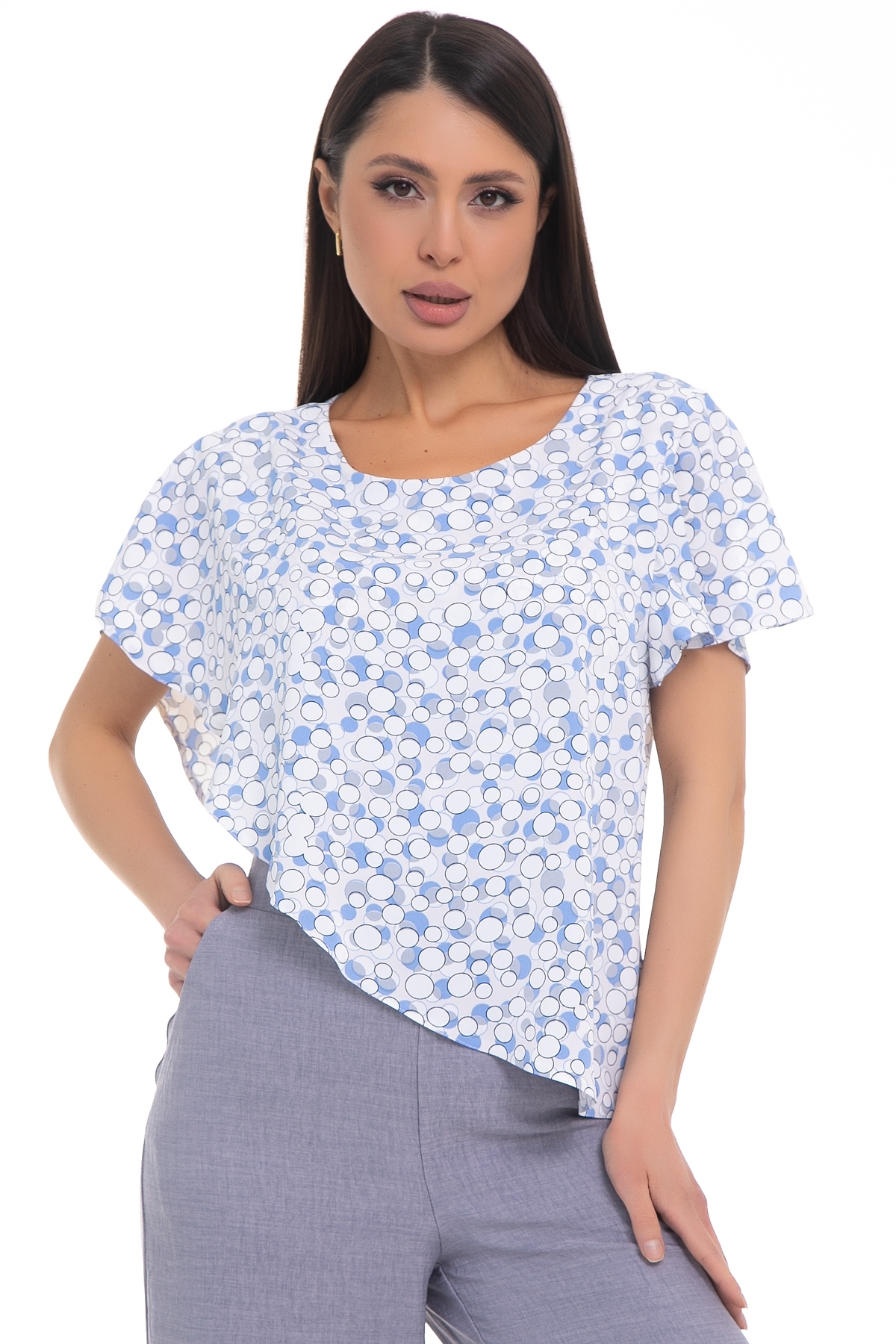 Бестселлер! Легкая блузка Diolche - идеальный выбор для создания стильного и запоминающегося образа. Рукав крылышко и ассиметричный крой придают блузке изысканность и неповторимость. Благодаря своему универсальному дизайну и качеству исполнения, эта блузка-туника с коротким рукавом станет вашим надежным помощником в создании идеального образа и скроет все недостатки фигуры. Эта блуза уместна везде - в офисе, на прогулке или празднике. Можно носить как с классическими брюками и юбками, так и с джинсами. Прекрасно смотрится как в заправленном состоянии, так и на выпуск.