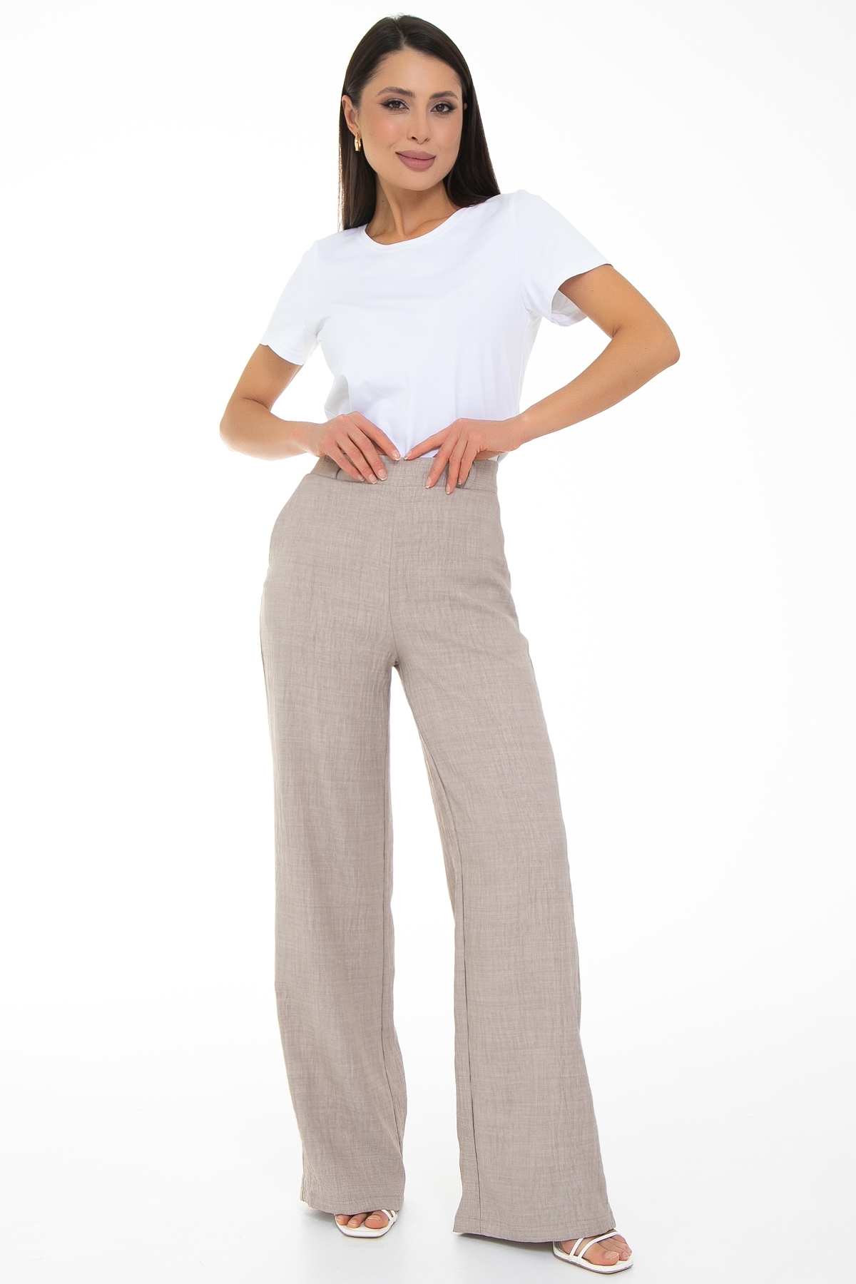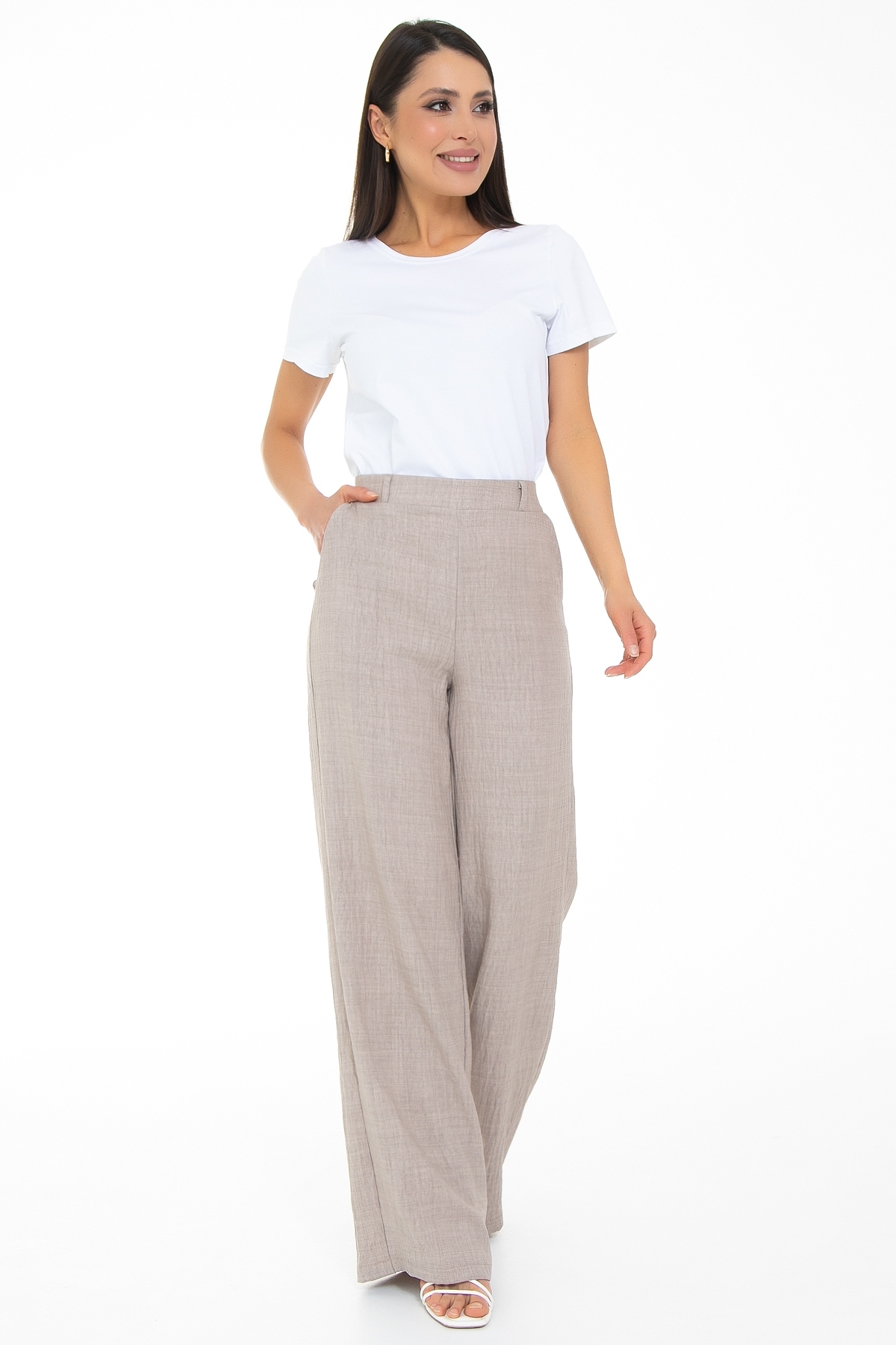 Женские летние брюки палаццо - идеальный выбор для жарких дней! Удобный крой и легкая вискозная ткань "жатка под лен" подарят вам свободу движений и максимальный комфорт. Модель, которая прекрасно садится на любую  фигуру и скрывает все недостатки. Благодаря резинке на талии, такая модель идеально подойдет большинству женщин. Пояс притачной, по переду классический с имитацией застежки, по спинке вставлена резинка шириной 4 см для плотного прилегания в области талии. В боковых швах удобные карманы. Прямые свободные боюки - идеальный выбор для создания стильного современного образа.