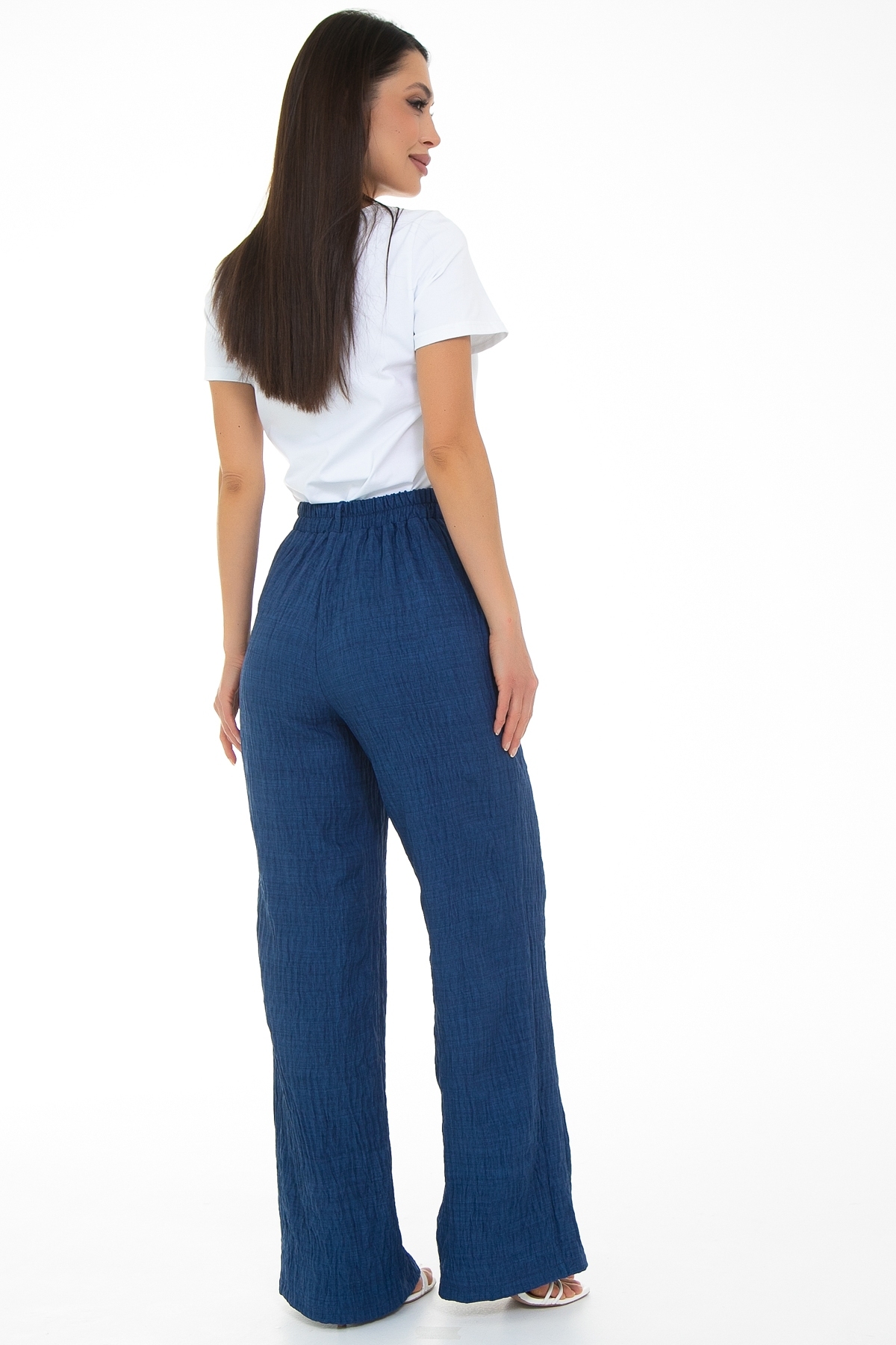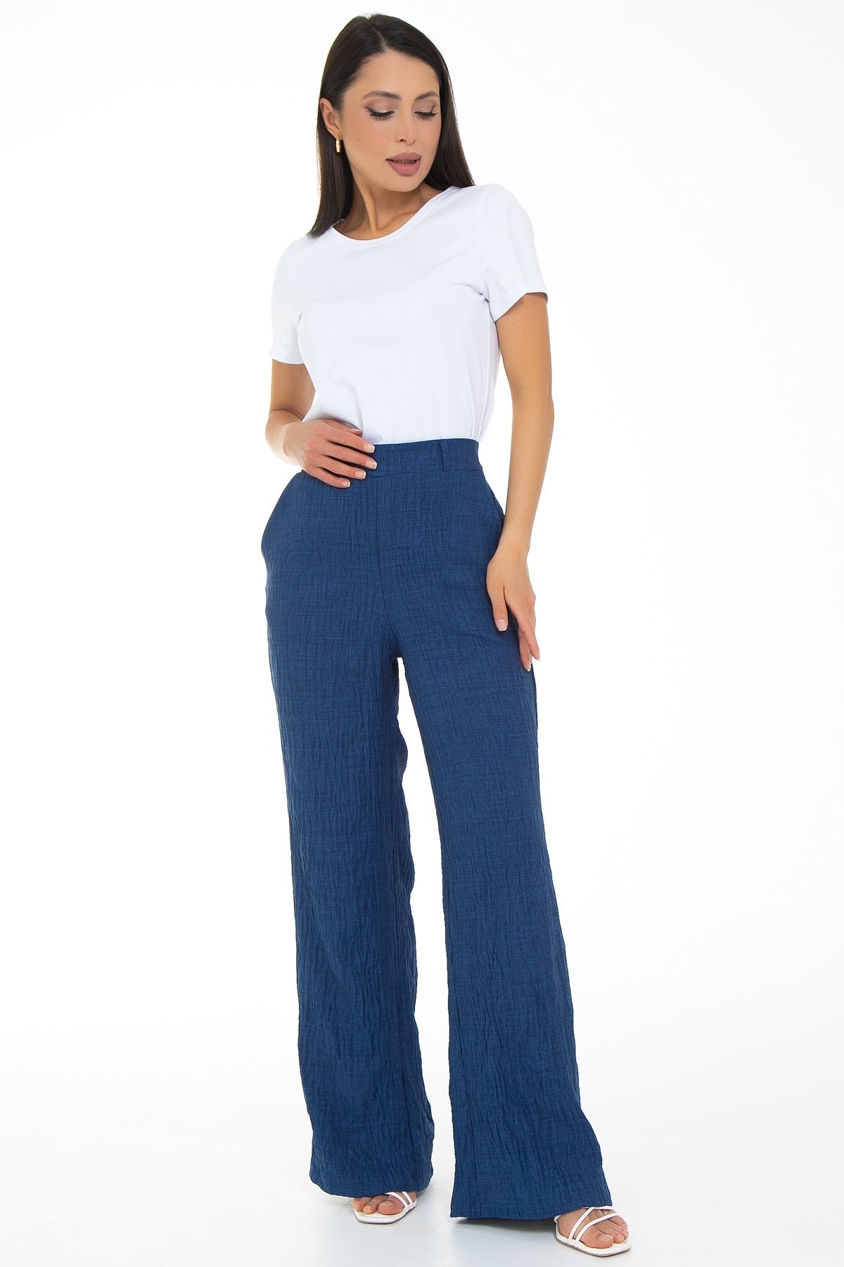 Женские летние брюки палаццо - идеальный выбор для жарких дней! Удобный крой и легкая вискозная ткань "жатка под лен" подарят вам свободу движений и максимальный комфорт. Модель, которая прекрасно садится на любую  фигуру и скрывает все недостатки. Благодаря резинке на талии, такая модель идеально подойдет большинству женщин. Пояс притачной, по переду классический с имитацией застежки, по спинке вставлена резинка шириной 4 см для плотного прилегания в области талии. В боковых швах удобные карманы. Прямые свободные боюки - идеальный выбор для создания стильного современного образа.