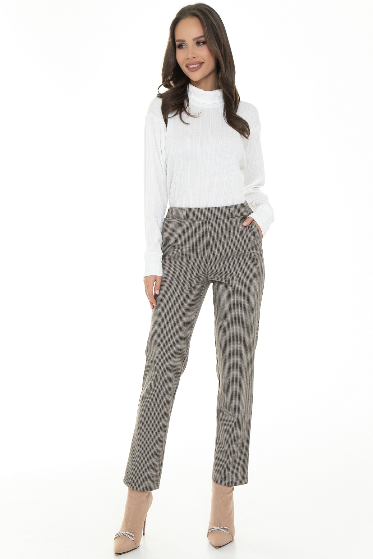 Современная модель прямых женских брюк из теплой костюмной ткани. Благодаря сочетанию вискозы  и эластана в составе ткани, брюки практически не мнутся, обладают износостойкостью, обеспечивают идеальный комфорт. Пояс притачной, по переду классический, по спинке вставлена резина шириной 4 см для плотного прилегания в области талии. В боковых швах удобные карманы.