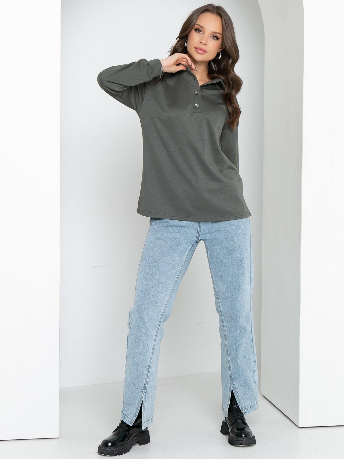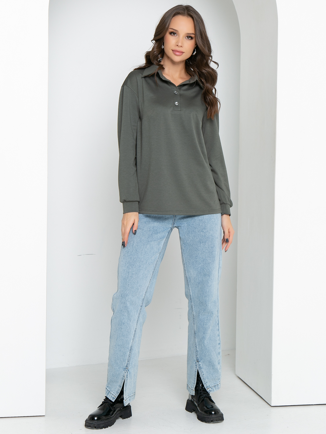 Свободный трикотажный джемпер поло с длинным рукавом- удобная и стильная одежда на все сезоны. По горловине пришит воротничок на стойке, спереди сделана планка с пуговичками. Рукав втачной, немного спущен, внизу на манжете. По боковым швам снизу сделаны разрезы