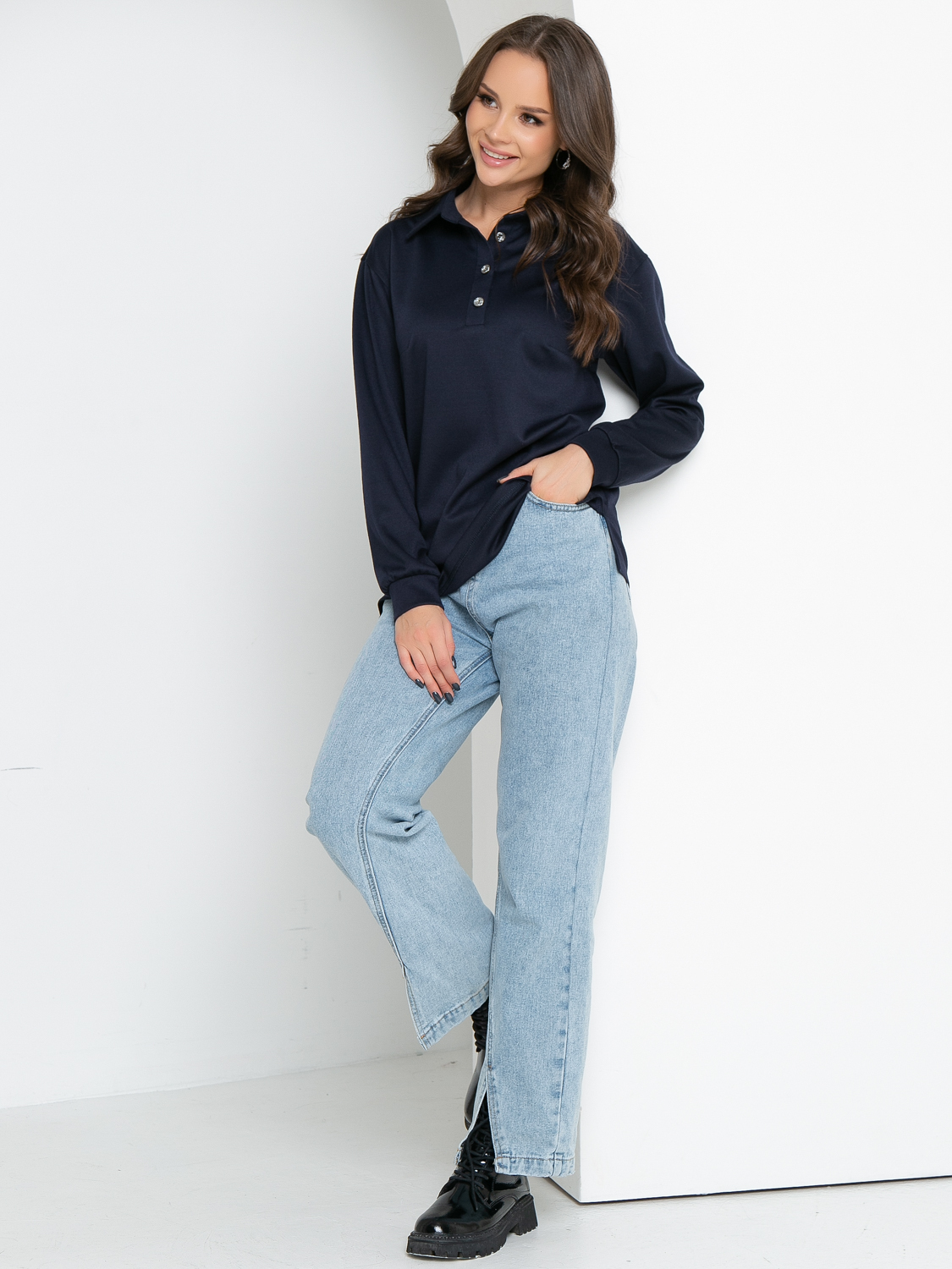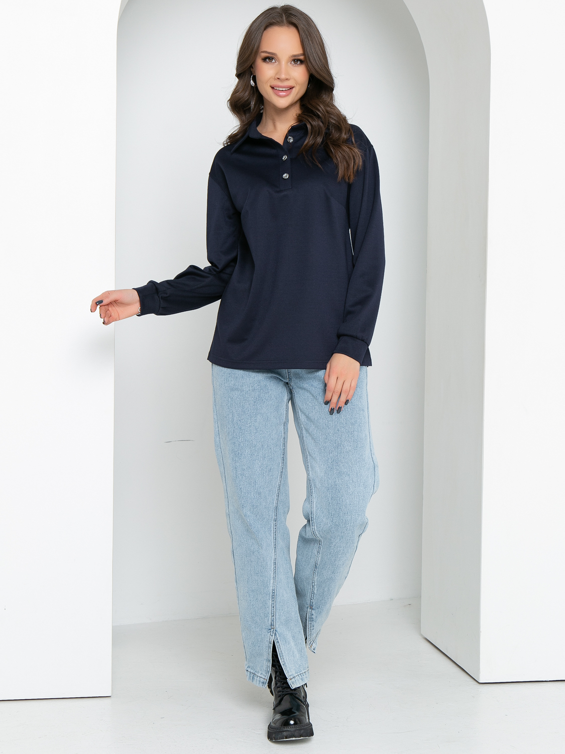 Свободный трикотажный джемпер поло с длинным рукавом- удобная и стильная одежда на все сезоны. По горловине пришит воротничок на стойке, спереди сделана планка с пуговичками. Рукав втачной, немного спущен, внизу на манжете. По боковым швам снизу сделаны разрезы